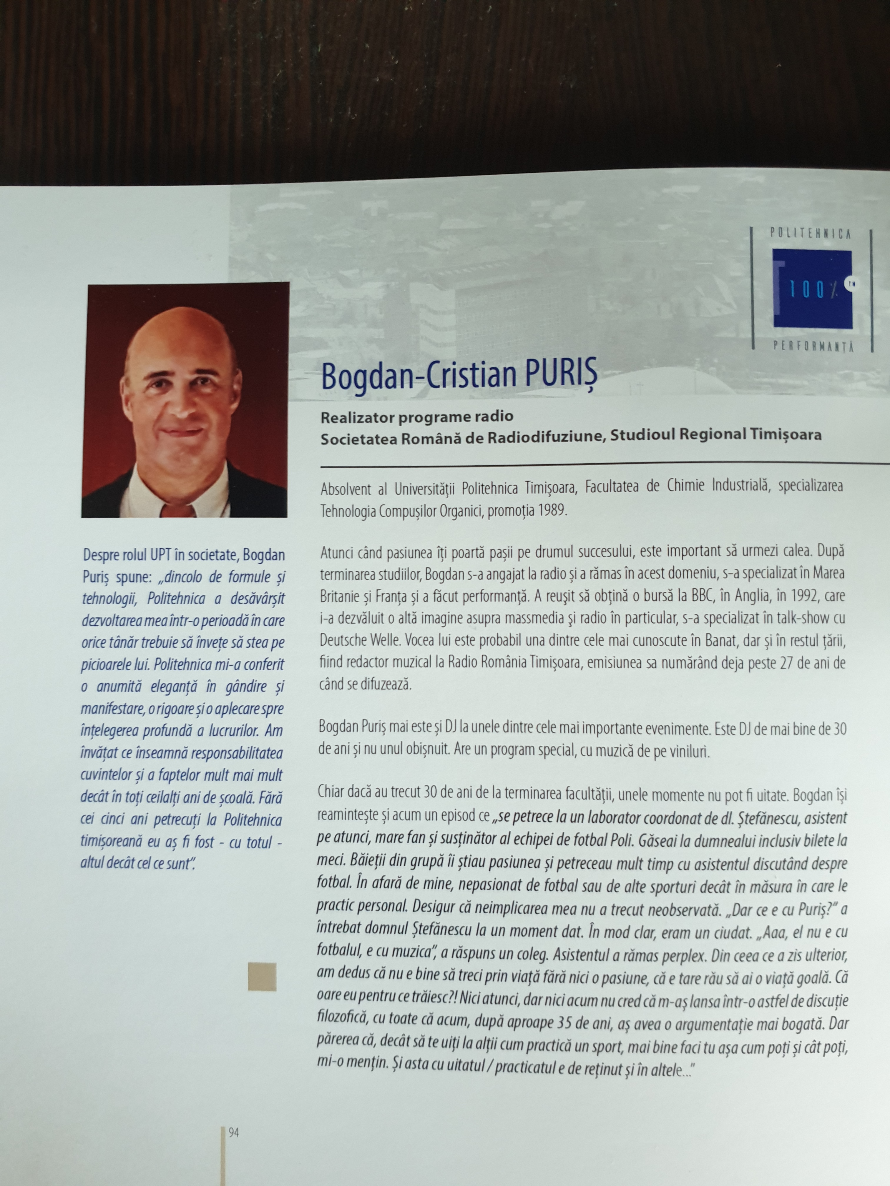 Între cei 100 de absolvenți ai UPT care au devenit astăzi oameni de succes în domeniile în care activează se numără și Bogdan Puriș, realizator la Radio Timișoara, cunoscut ascultătorilor pentru cea mai longevivă emisiune muzicală “Pop Matineu”, dar și alte emisiuni de cultură muzicală.