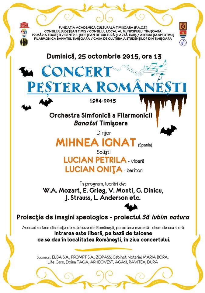 Ca în fiecare toamnă, Peştera Româneşti din judeţul Timiş găzduieşte, în ultima duminică a lunii octombrie, un concert simfonic susţinut de Filarmonica Bantul din Timişoara. Anul acesta concertul are loc în 25 octombrie, de la ora 13.00.