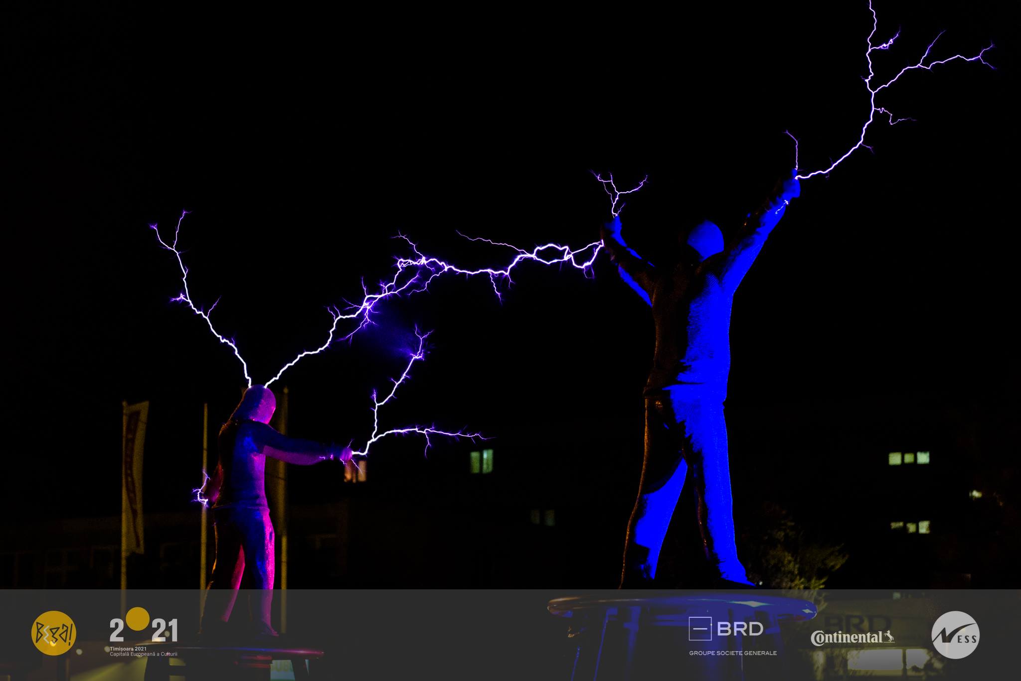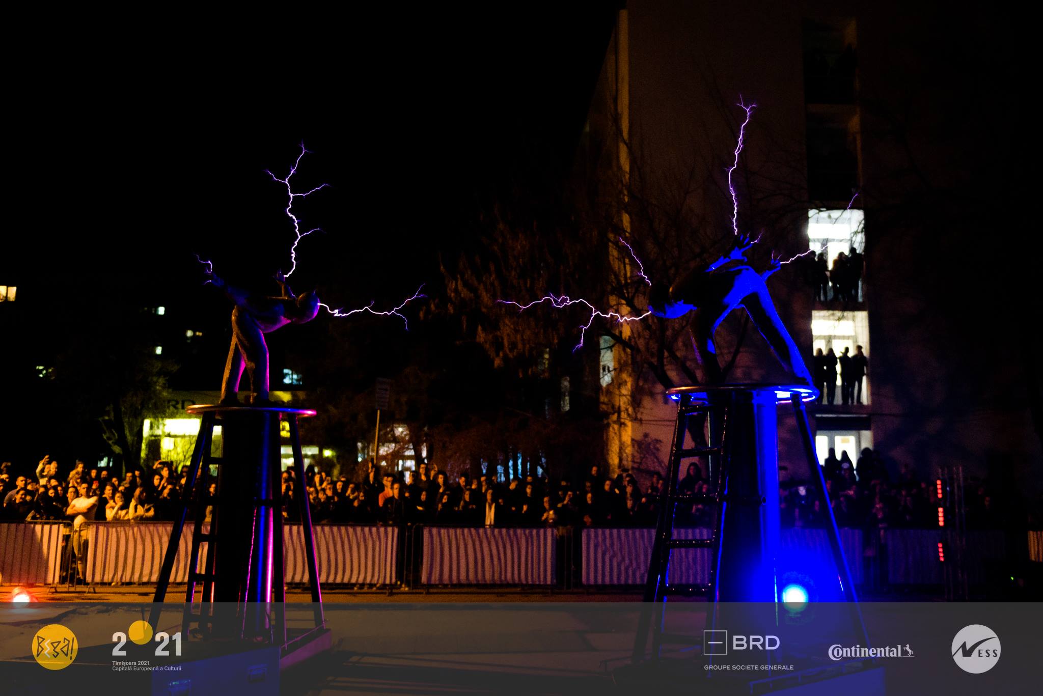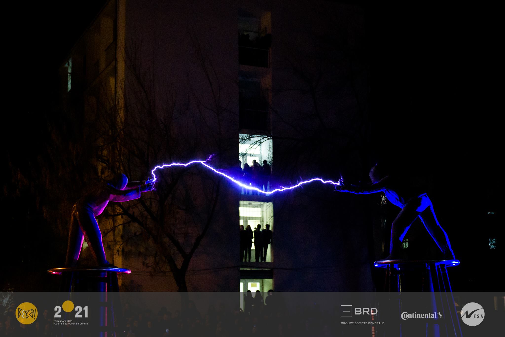 Spectacol electrizant în Complexul Studenţesc din Timişoara, primul din cele cinci cartiere unde se va prezenta The Lightning Project. Pe muzica timişoreanului Alex Zimcea, doi dansatori britanici au prezentat un show nemaivăzut prin această parte. Lords of Lightning creează dueluri cu fulgere, generând arcuri electrice de milioane de volți, explică directorul Asociaţiei Plai, Norbert Tako.