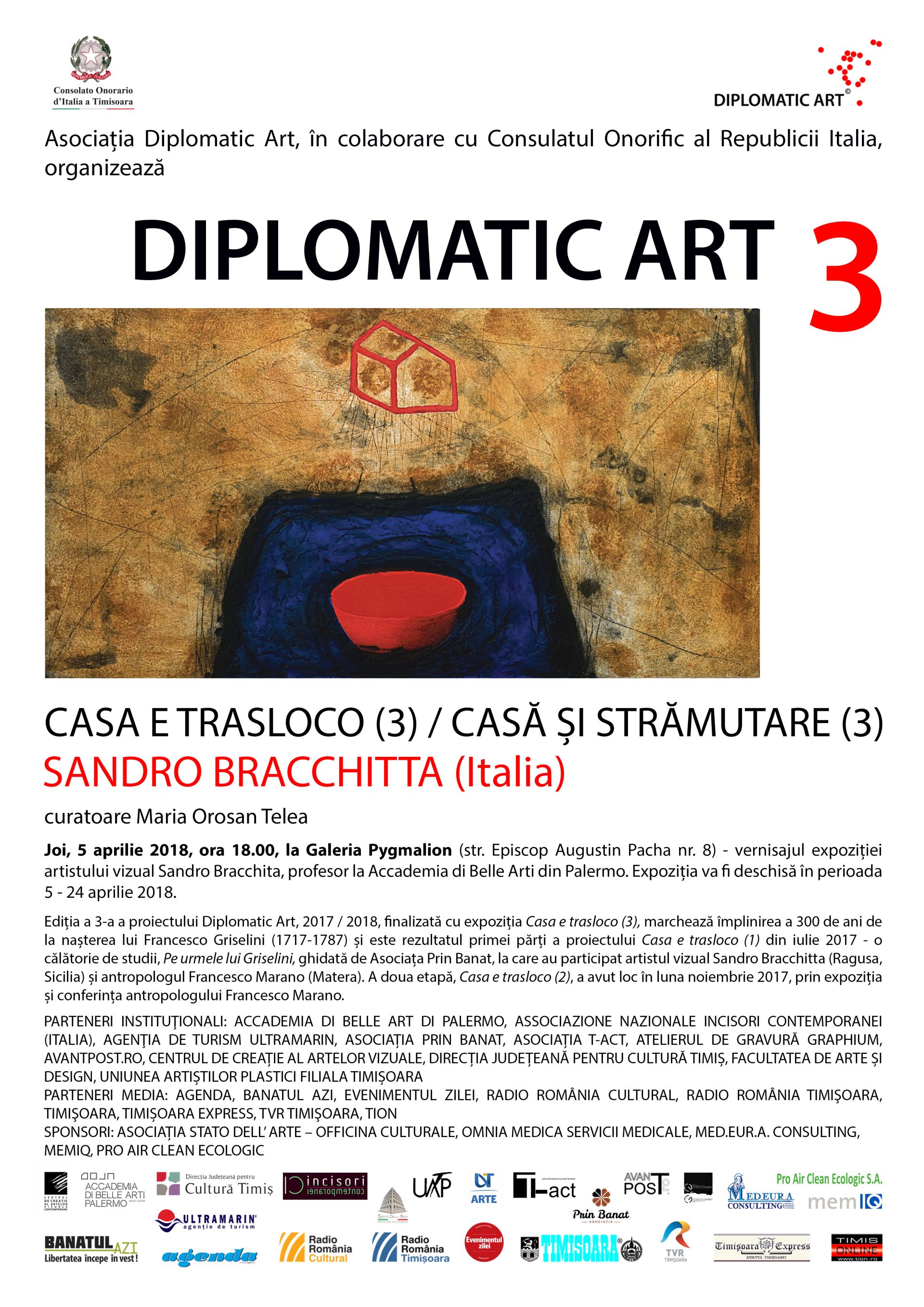 Galeria Pygmalion din Timișoara găzduiește joi, 5 aprilie 2018, de la ora 18.00, vernisajul expoziției semnate de Sandro Bracchitta. Expoziția reprezintă a treia și ultima etapă a proiectului Diplomatic Art, intitulat generic  Casa e trasloco / Casă și strămutare, care a început anul trecut.