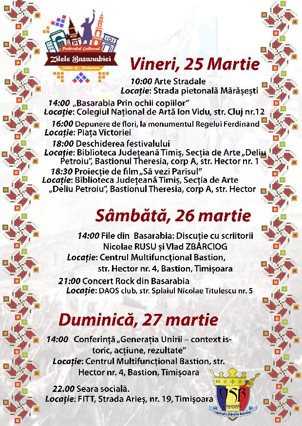 De 16 ani, în luna martie, Organizația Studenților Basarabeni din Timișoara celebrează Unirea Basarabiei cu România, înfăptuită în anul 1918, cu unul dintre cele mai frumoase evenimente ale anul – Festivalul Cultural ”Zilele Basarabiei”.