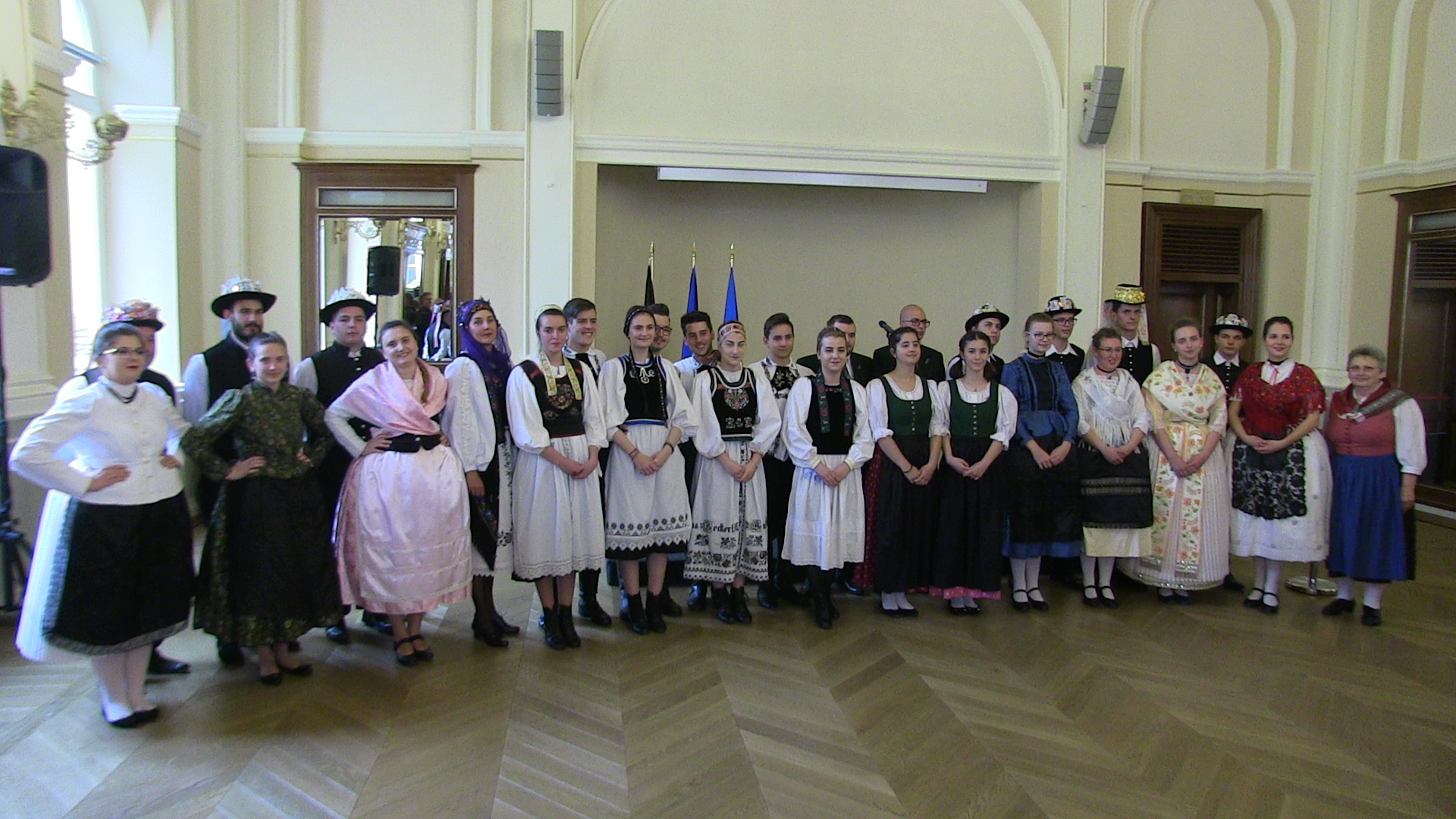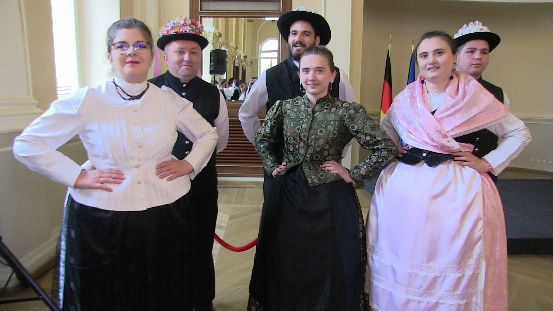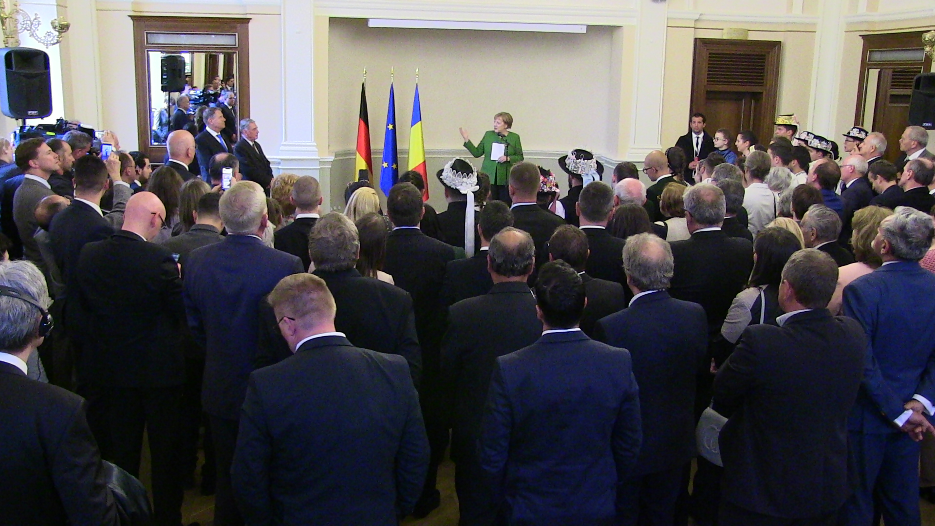 Cancelarul Germaniei Angela Merkel şi preşedintele României Klaus Johannis s-au întâlnit cu reprezentanţi ai comunităţii germanilor din România în nou renovata sală a oglinzilor. Oaspeţii au fost întâmpinaţi de perechi în porturi populare ale saşilor transilvăneni, şvabilor bănăţeni şi ale altor comunităţi regionale ale germanilor din ţara noastră. Cancelarul german a subliniat rolul pe care germanii din diaspora îl joacă în acepţiunea Guvernului Federal.