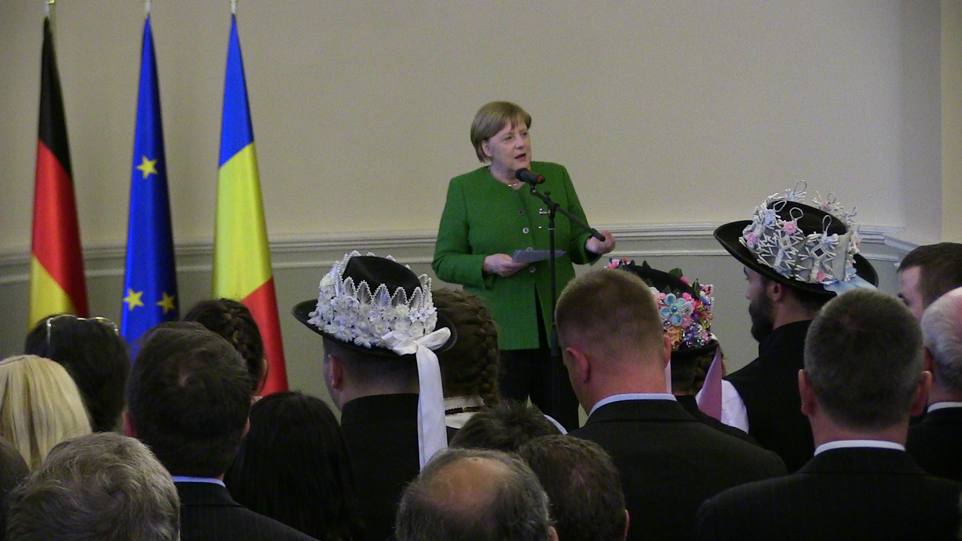 “Mă bucur să fiu alături de dumneavoastră în Sala Oglinzilor a Forumului Democrat al Germanilor din România şi va multumesc pentru primirea călduroasă. Doresc să vă asigur – şi asta o spun în numele întregului Guvernul al Germaniei – că suntem mândri de faptul că avem minorităţi germane îm afara graniţelor ţării noastre. Vom povesti şi tinerilor din ţara noastră cum au apărut aceste minorităţi, ce istoria au parcurs şi cum ele trăiesc altfel şi altundeva o parte din trecutul nostru, reprezentând o îmbogăţire a ceea ce noi numim patrimoniul german într-un sens mai larg”, a declarat Angela Merkel.
