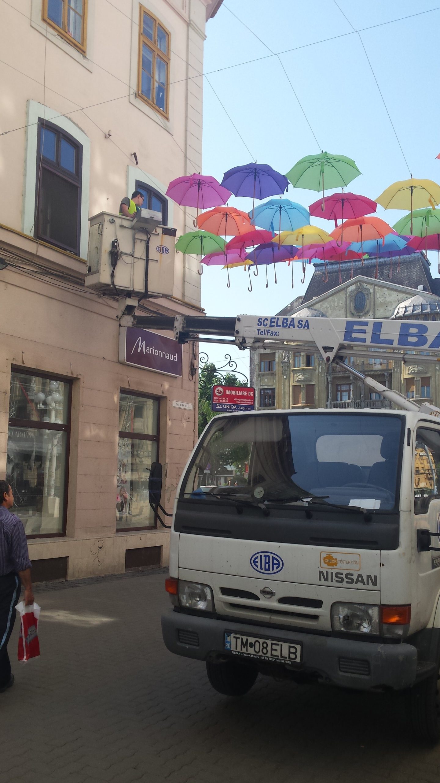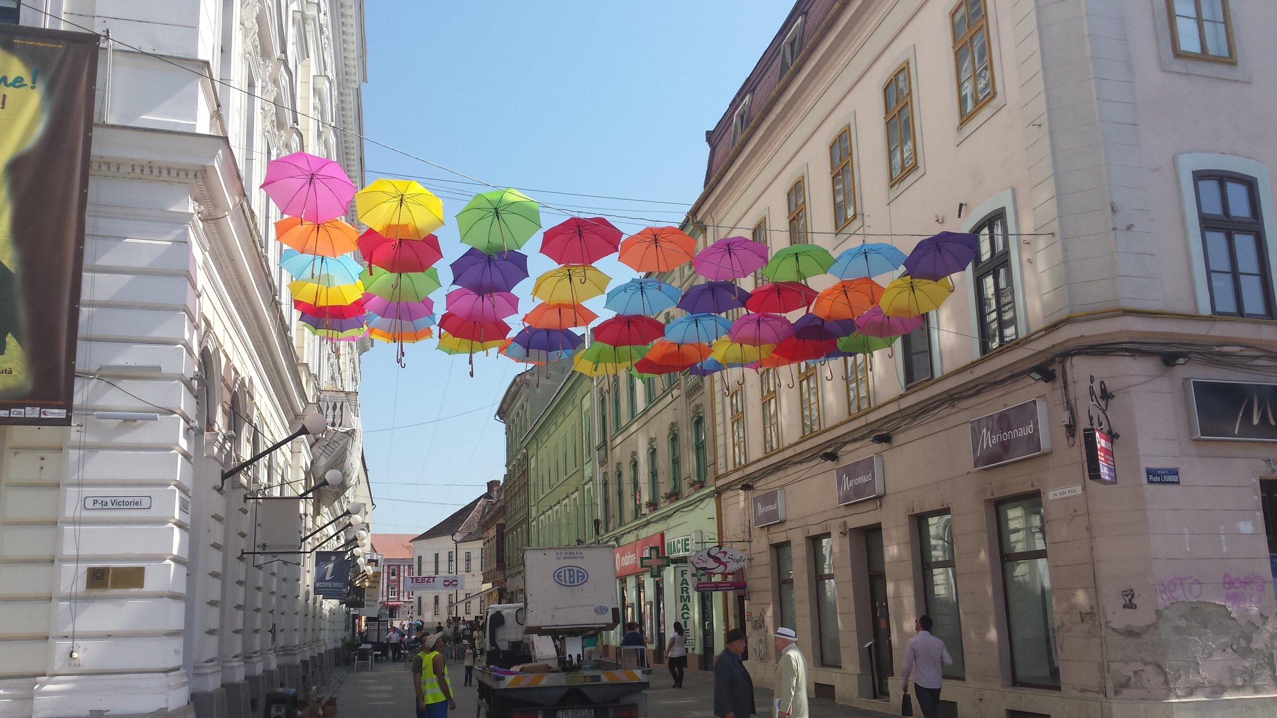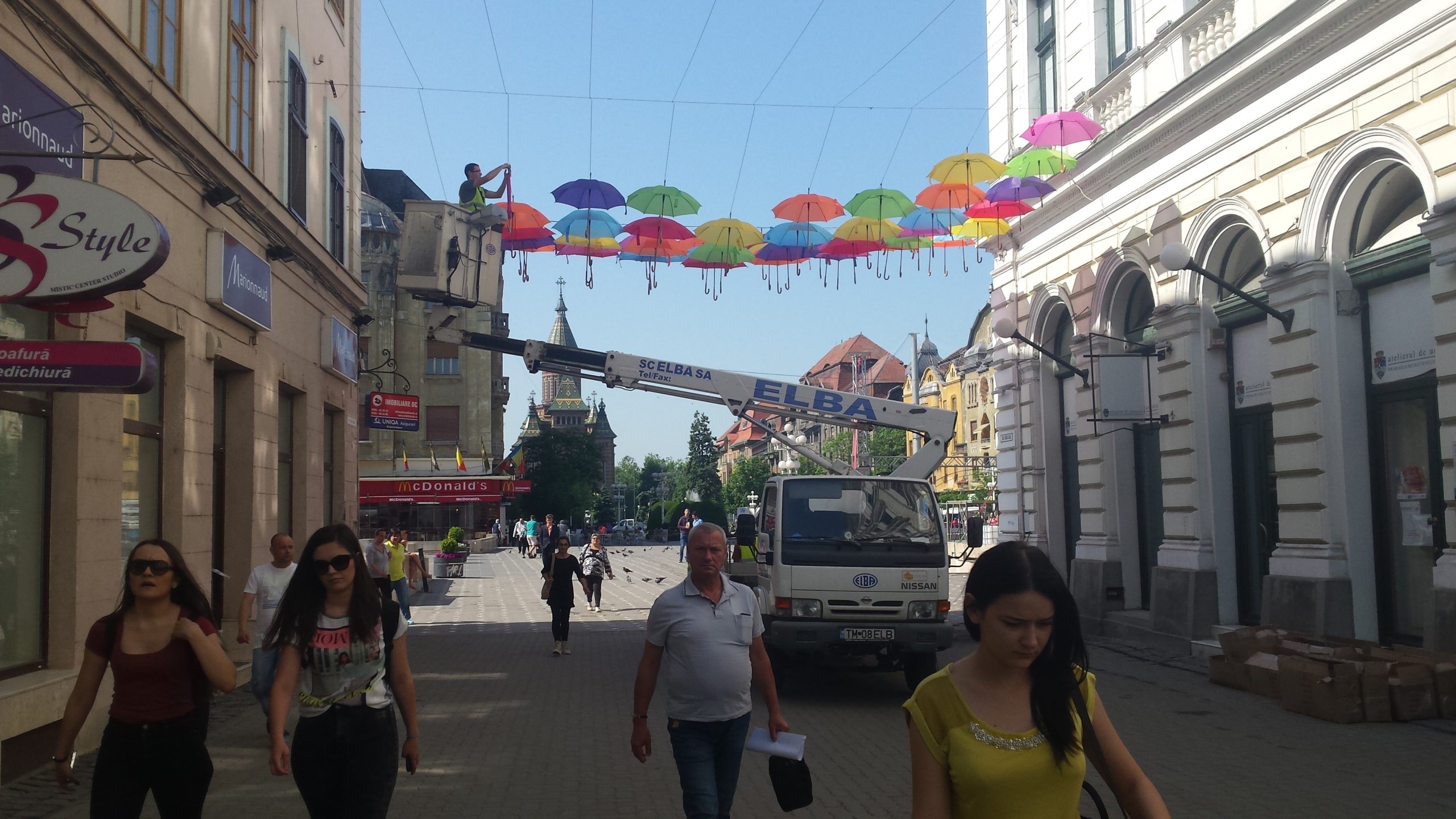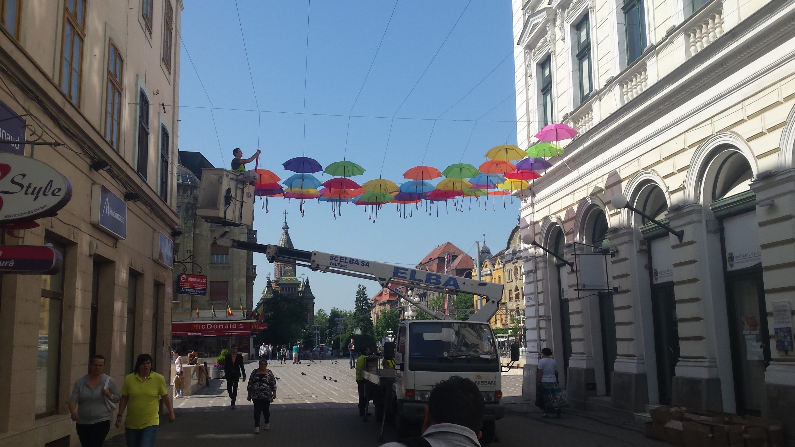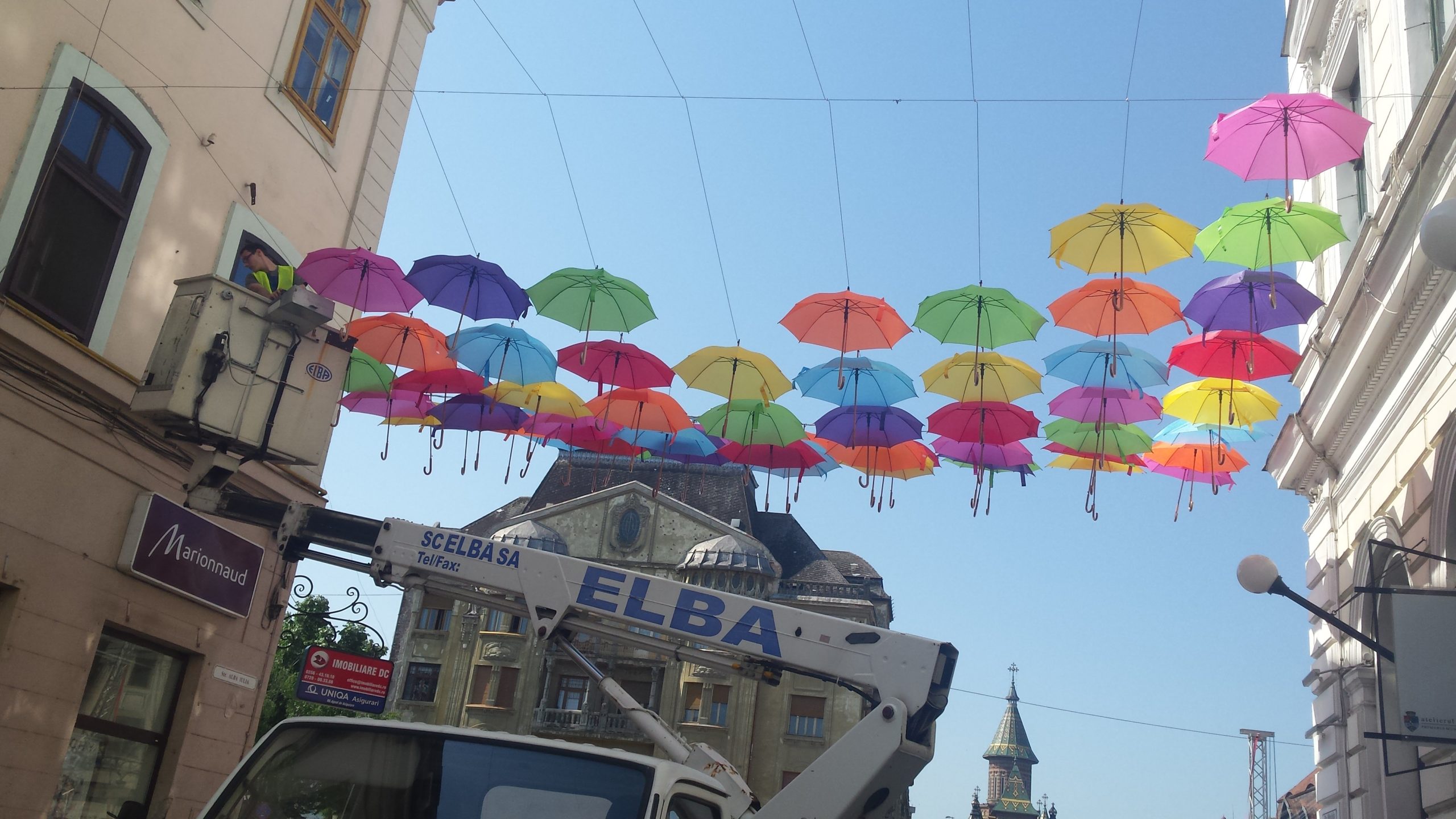 Marți dimineața a început montarea umbrelelor care vor forma o nouă cupolă multicoloră pe strada Alba Iulia din Timișoara. Acoperișul din umbrele colorate va fi finalizat miercuri, iar timișorenii care vor să ajute sunt așteptați de la ora 14:00 în centrul orașului. Voluntarii vor primi la finele acţiunii, ca răsplată, câte o umbrelă.