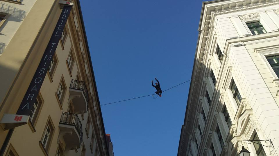 Zeci de timișoreni au urmărit, cu sufletul la gură, ‘plimbarea’ unui tânăr care a traversat, vineri după-amiază, strada Mărășești din centrul orașului. Nu a fost o plimbare oarecare pentru că tânărul, programator IT, pasionat de slackline a decis să traverseze pietonala pe o… coardă de câțiva centimetri. Practic, Flaviu Cernescu, supranumit ‘Balaurul din Transilvania’ a trecut de pe cornișa Hotelului Timișoara pe cea a Operei Naționale, la zeci de metri înălțime.