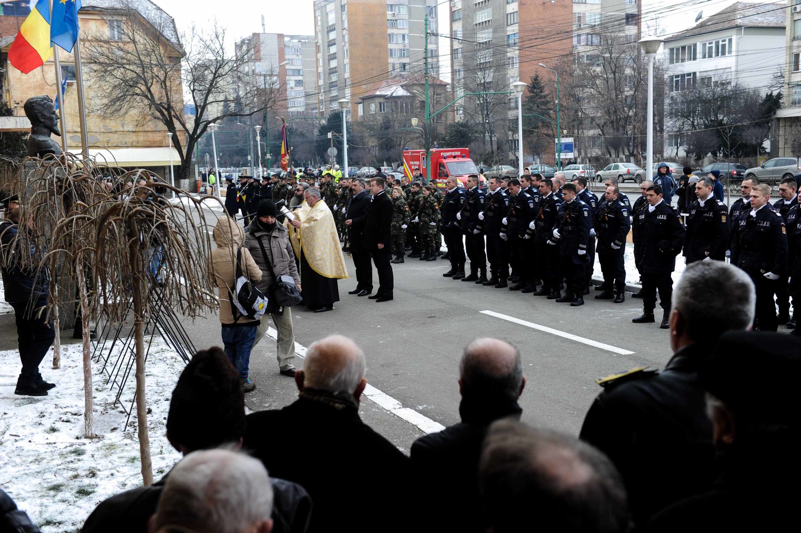 Programul a început cu un moment religios, la bustul situat în faţa Inspectoratului de Poliţie Timiş, urmat de Hora Unirii şi defilarea unui detaşament de onoare format din reprezentanţi ai instituţiilor militare din regiune. Unul dintre principalele momente a fost defilarea Gărzii de Onoare după care cei prezenți s-au prins în Hora Unirii.