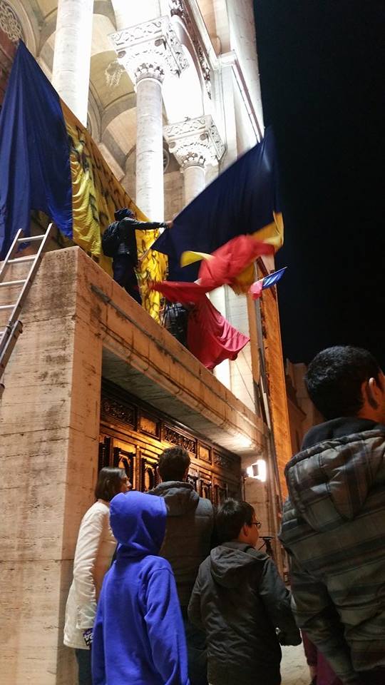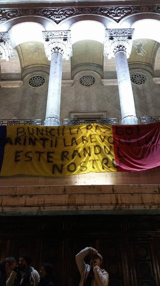 Pe balconul Operei Române a fost arborat un drapel pe care stă scris: „Bunicii la război, părinții la Revolutie, este rândul nostru!„.