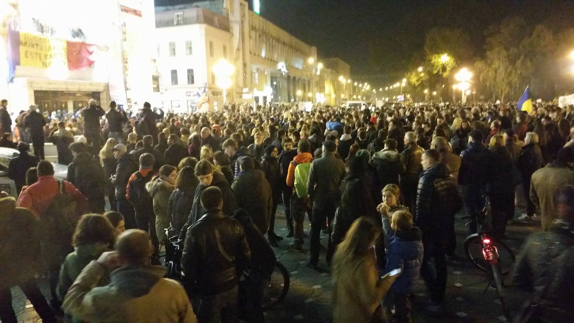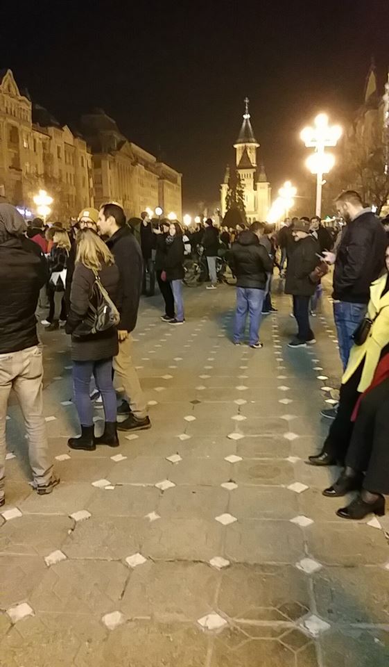 După o oră de la începerea protestului, s-au adunat în Piața Victoriei sute de timișoreni care scandează împotriva corupției și a clasei politice. Oamenii strigă „Jos Parlamentul”, „Demisia” și „Toate partidele fură prin rotație”. Ulterior manifestanții s-au îndreptat în marș spre Catedrala Mitropolitană și Primăria Timișoara.