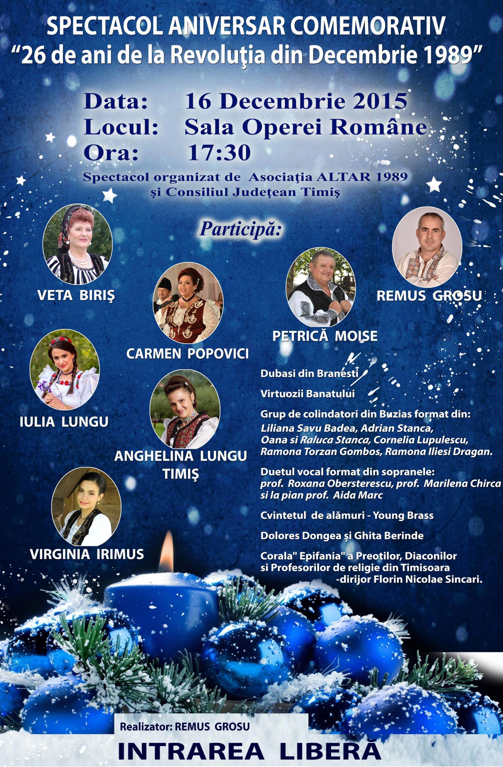 Sala Operei Române din Timişoara a găzduit în seara zilei de 16 decembrie spectacolul dedicat eroilor Revoluţiei din 1989. Împreună cu preotul paroh Ionel Popescu şi Corala „Epifania” a preoţilor, diaconilor şi profesorilor de religie din Timişoara, dirijată de profesorul Nicolae Şincari,  toţi cei prezenţi în sală au rostit rugăciunea „Tatăl nostru”. Preşedintele Asociaţiei ALTAR 1989,  Virgil Hosu, i-a înmânat preşedintelui Emil Constantinescu o diplomă şi o distincţie de onoare. Spectacolul artistic a avut un conţinut adecvat: piese din repertoriul românesc şi internaţional, colinde, pricesne dar şi doine şi cântece populare. Preşedintele Emil Constantinescu şi primarul Timişoarei, Nicolae Robu au urmărit întregul spectacol. Cântecele patriotice au ridicat sala în picioare. La sfârşitul spectacolului, în Piaţa Operei au fost aprinse candele în memoria eroilor Revoluţiei.