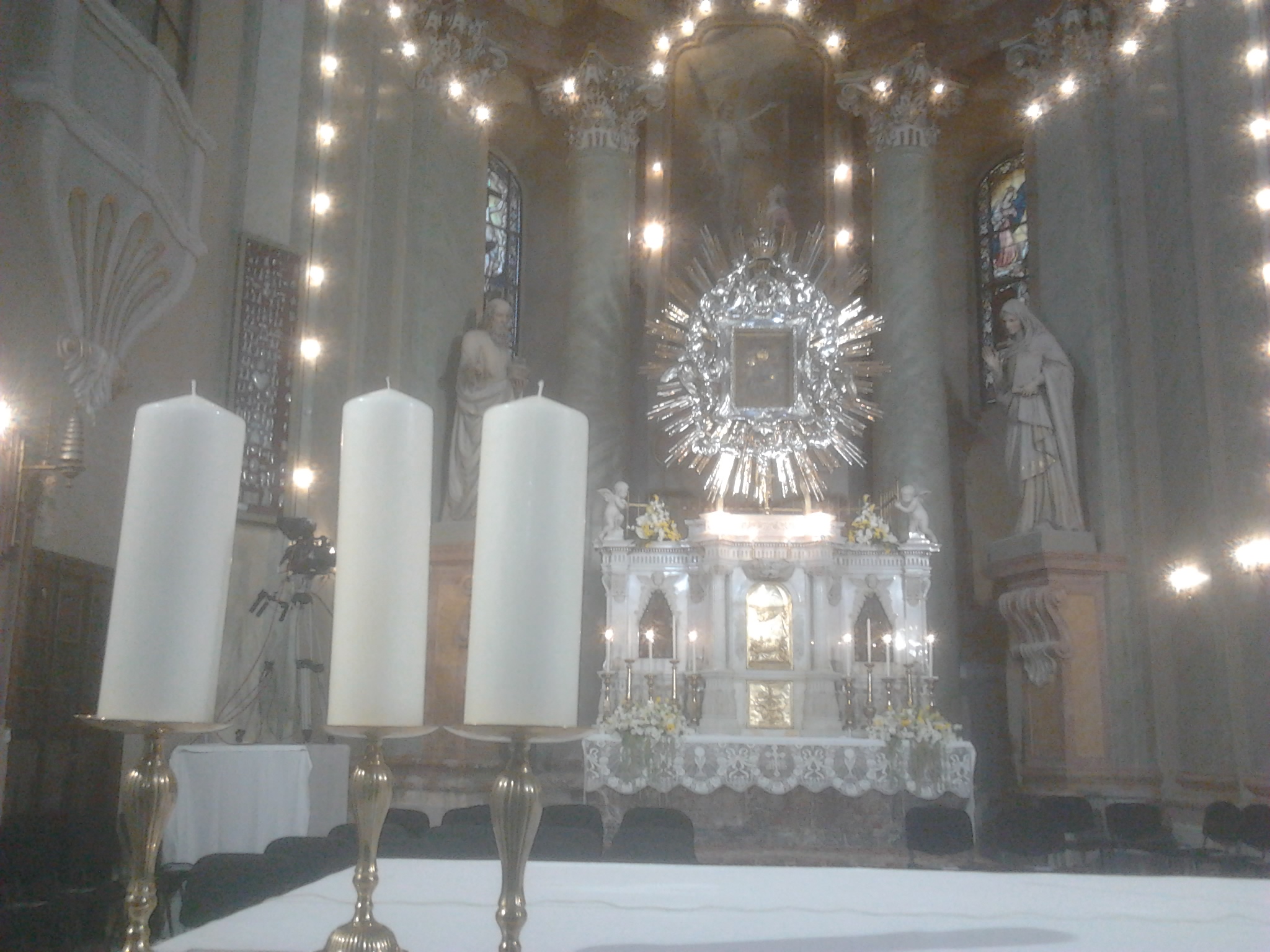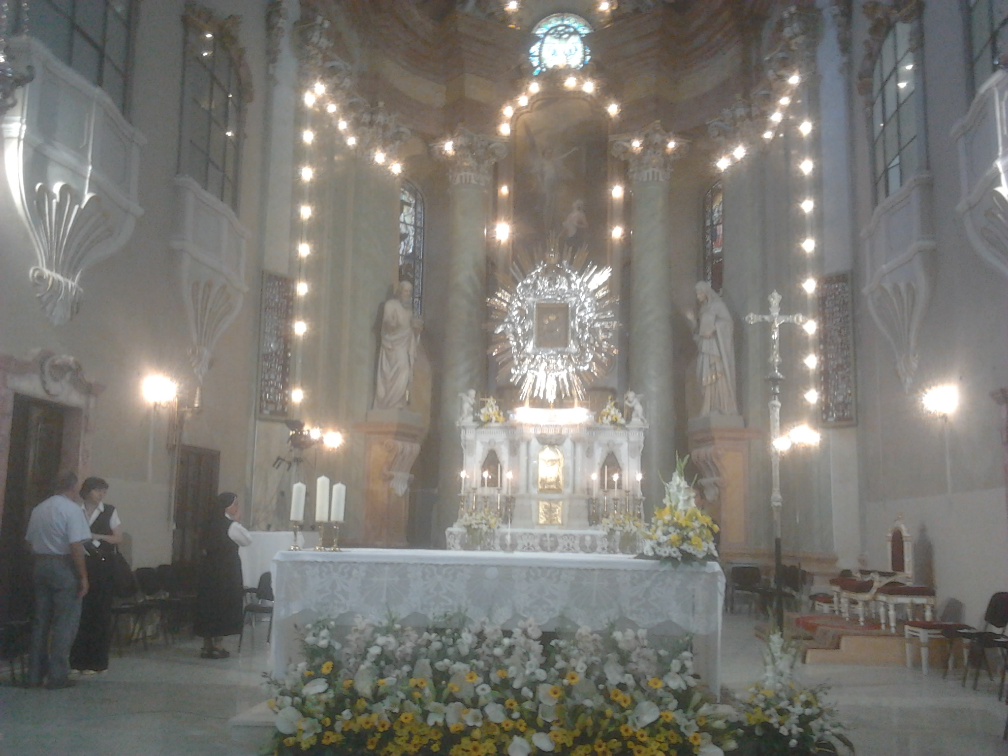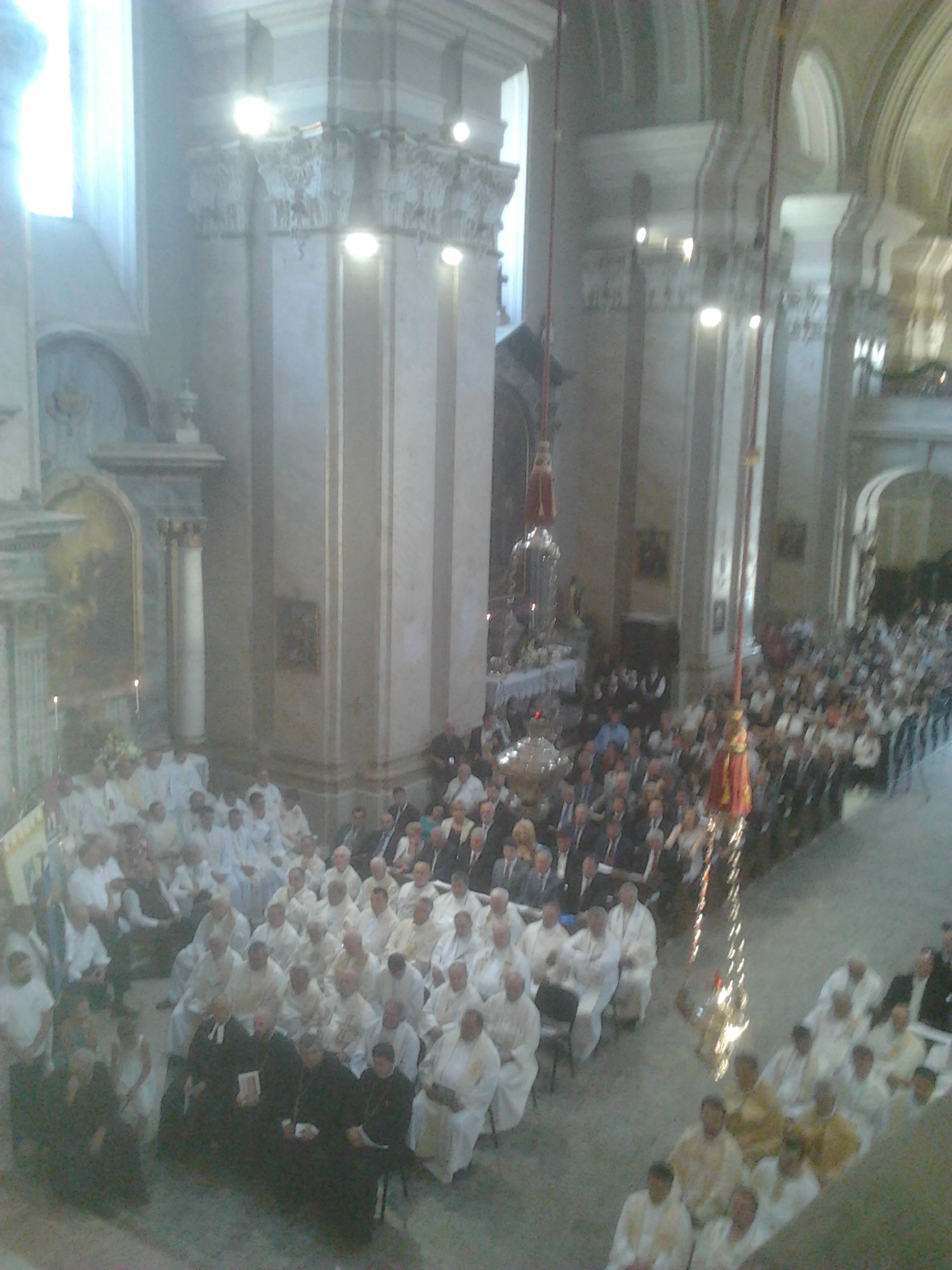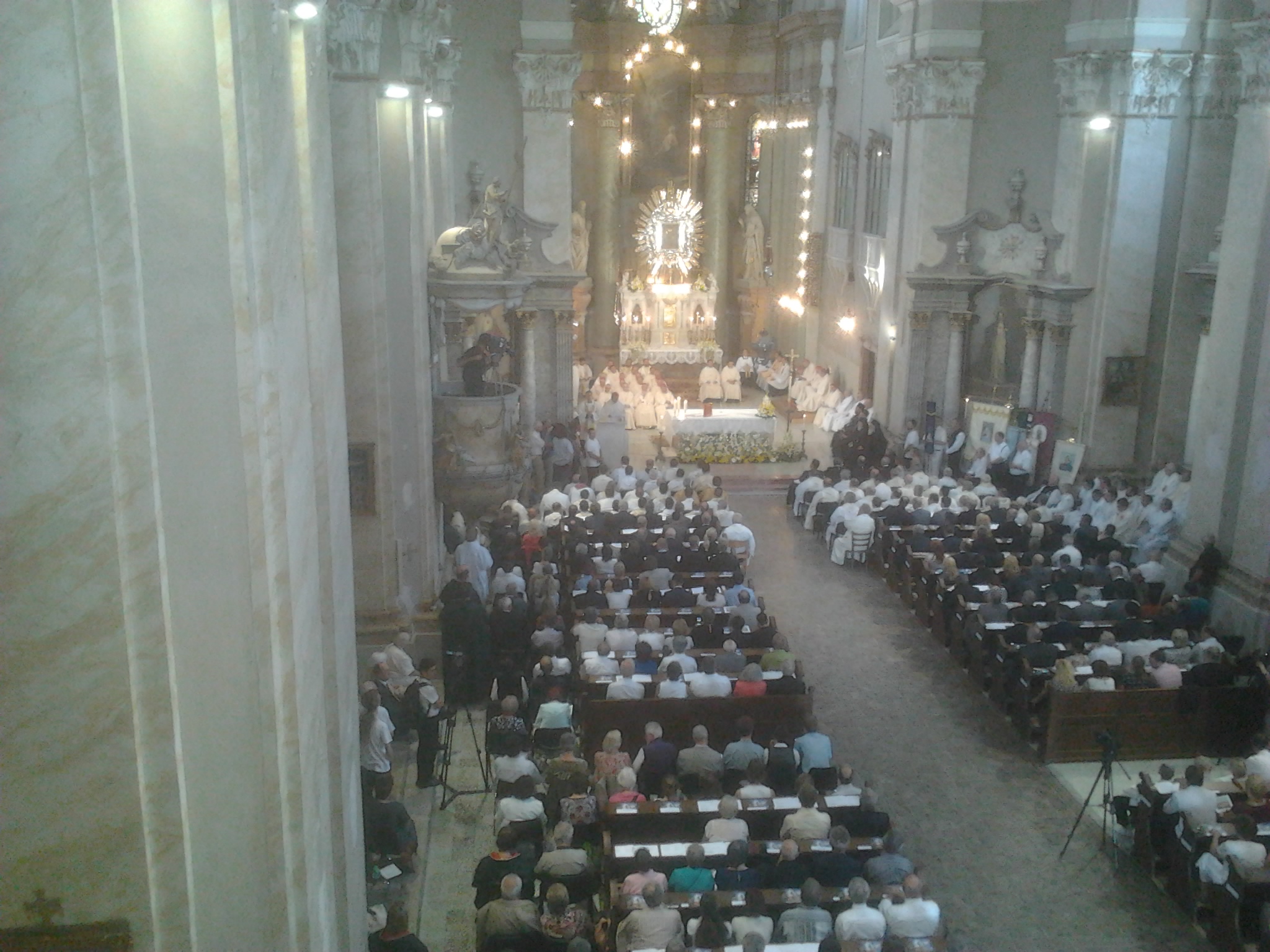 Datorită numărului mare de preoţi, oficialităţi, delegaţi şi oaspeţi, o mare parte dintre participanţi au urmărit Liturghia pontificală în piaţa din faţa lăcaşului de pelerinaj, pe două ecrane de mari dimensiuni, închiriate în acest sens de Episcopia Romano-Catolică de Timişoara.