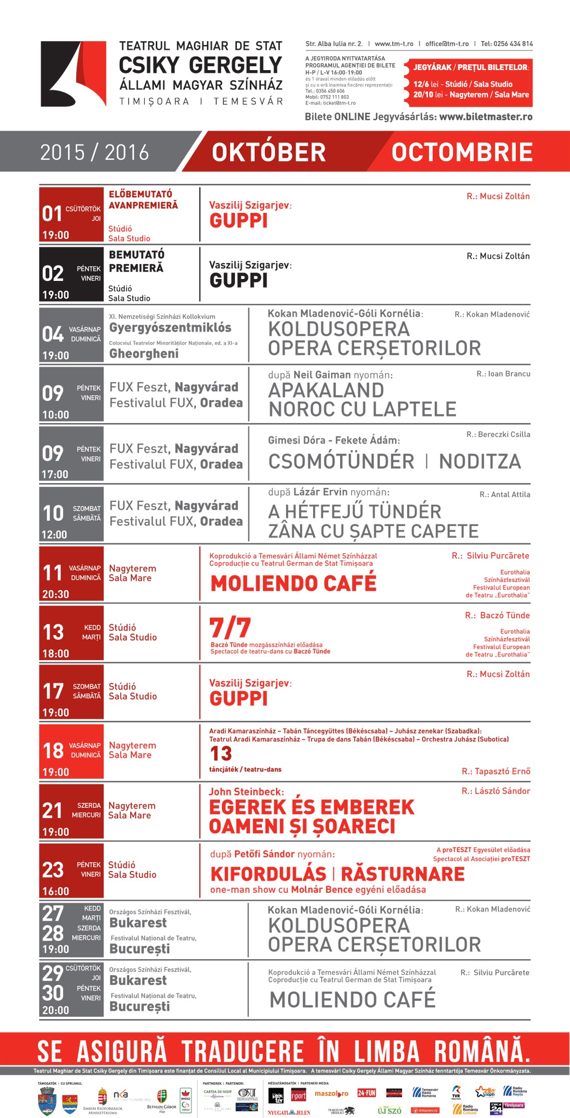 Posesorii de Kult Card au intrarea gratuită. Abonamentele Kult Card mai sunt încă disponibile la casa de bilete. Următoarea reprezentație va avea loc sâmbătă, 17 octombrie.