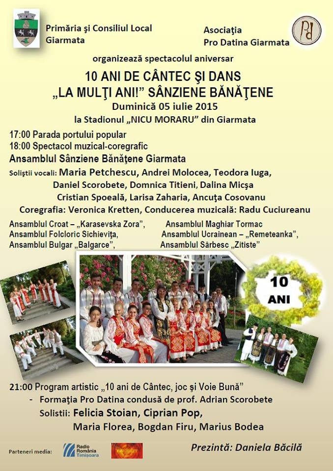 Iubitorii cântecului şi dansului popular sunt invitaţi la Giarmata duminică, 5 iulie 2015, să sărbătorească „10 ani de cântec şi dans” pe care Ansamblul Sânziene Bănăţene îi împlineşte anul acesta.