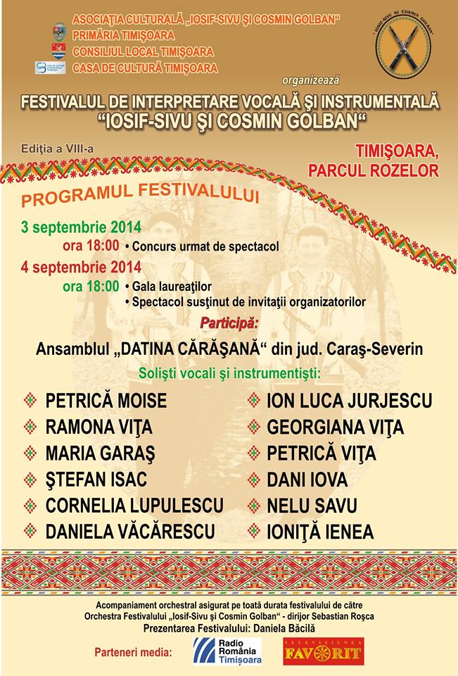 Miercuri şi joi, de la ora 18:00, în Parcul Rozelor din Timişoara se va desfăşura cea de-a VIII-a ediţie a Festivalului concurs de interpretare vocală şi instrumentală „Iosif Sivu şi Cosmin Golban”.