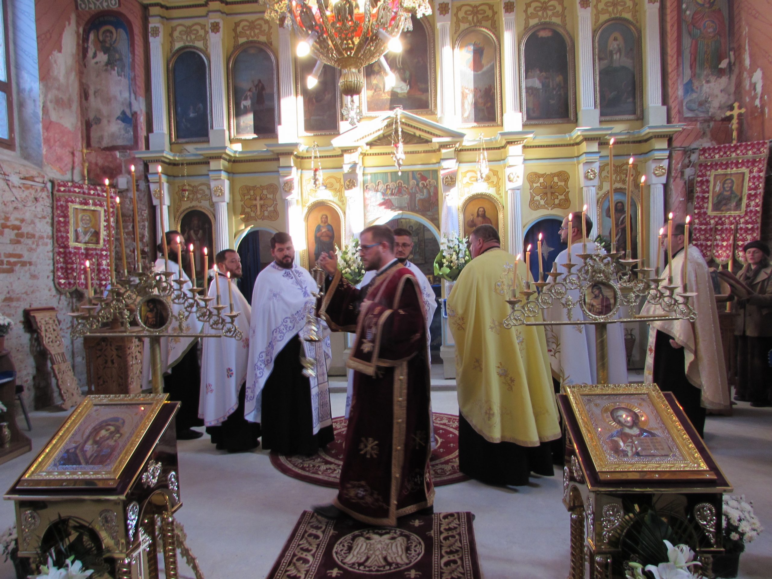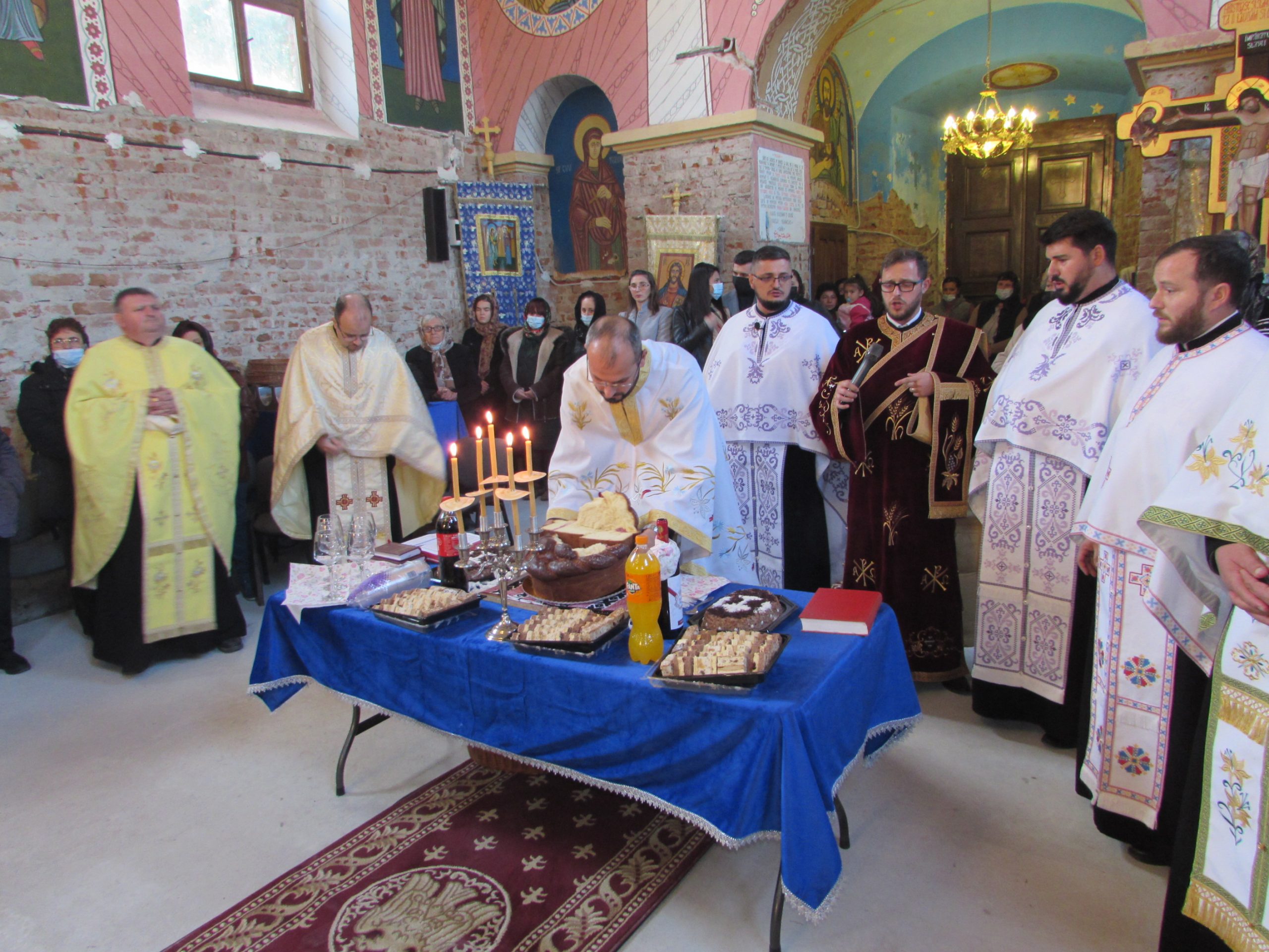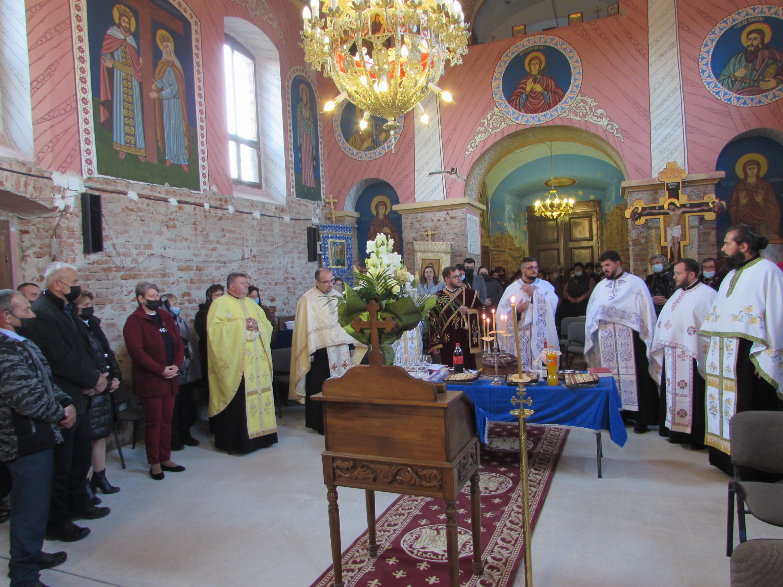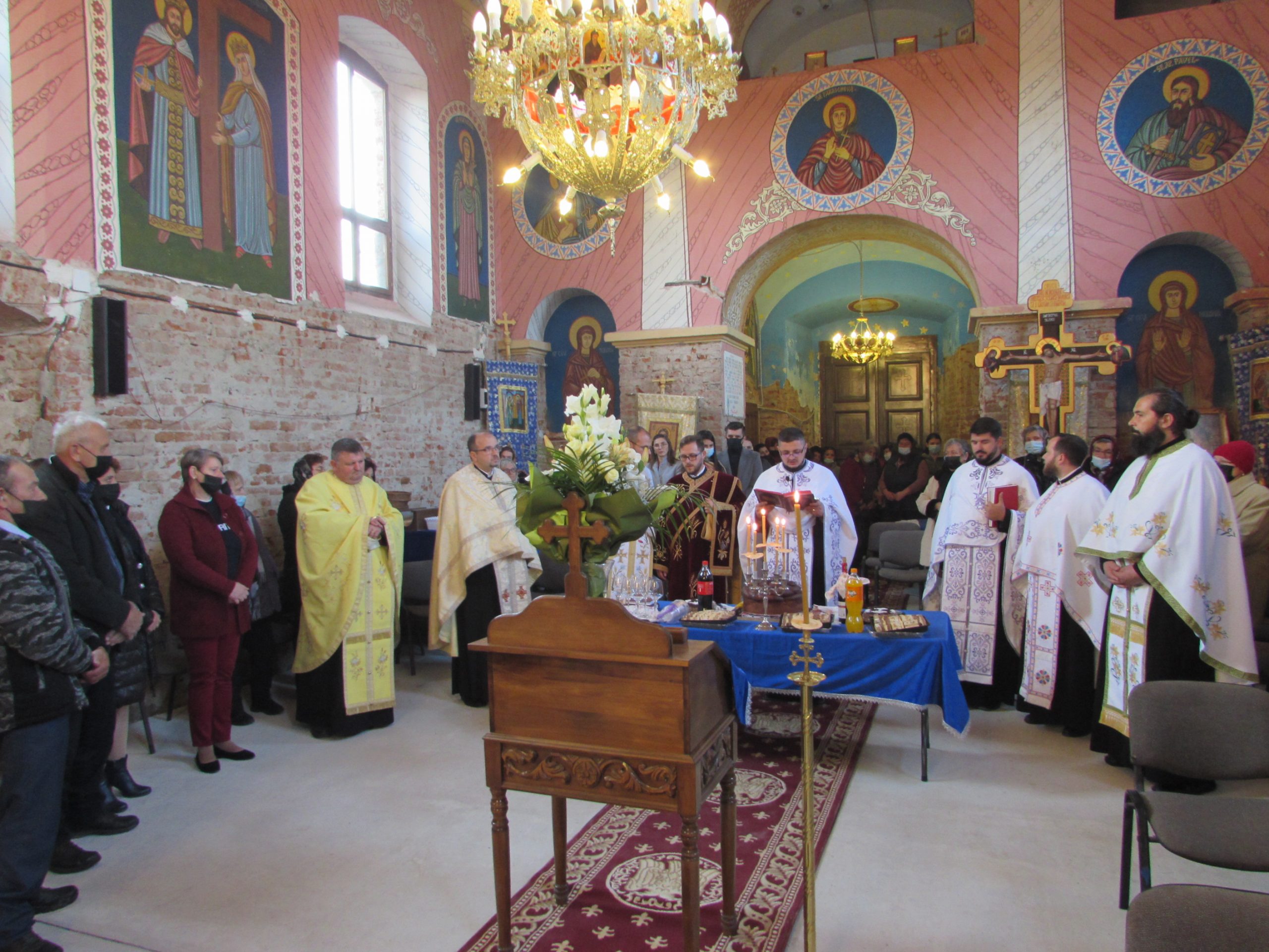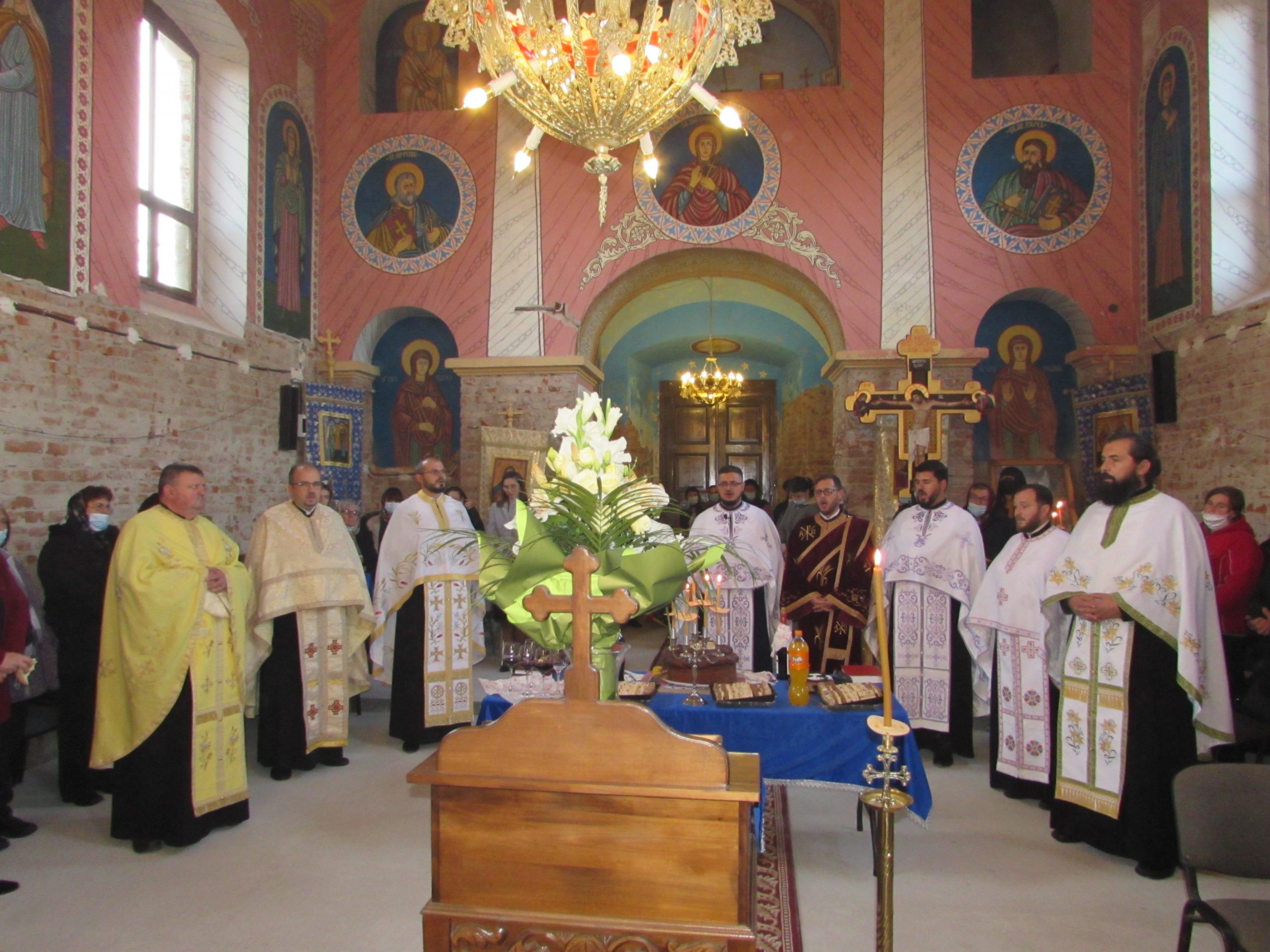 A început vecernia de rugă, cu participarea a șapte preoți din Arhiepiscopia Aradului și unul cu origini în Mănăștur, acum preot în Sânmartinu Sârbesc. Aranjamentul floral accentuează atmosfera de sărbătoare. Cei mici iau parte la bucuria colectivă în stil propriu.