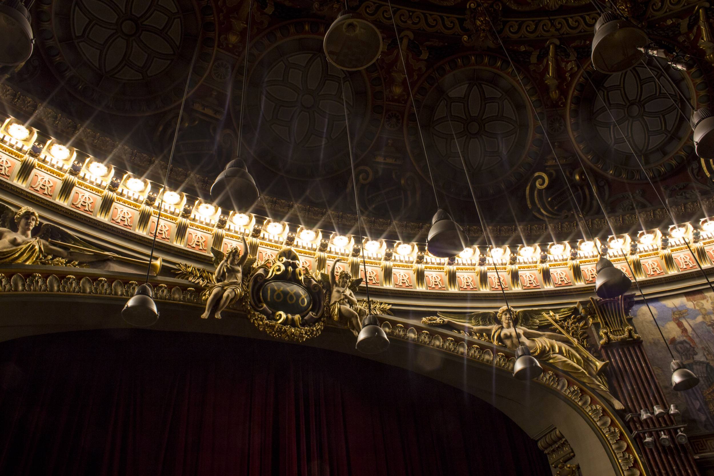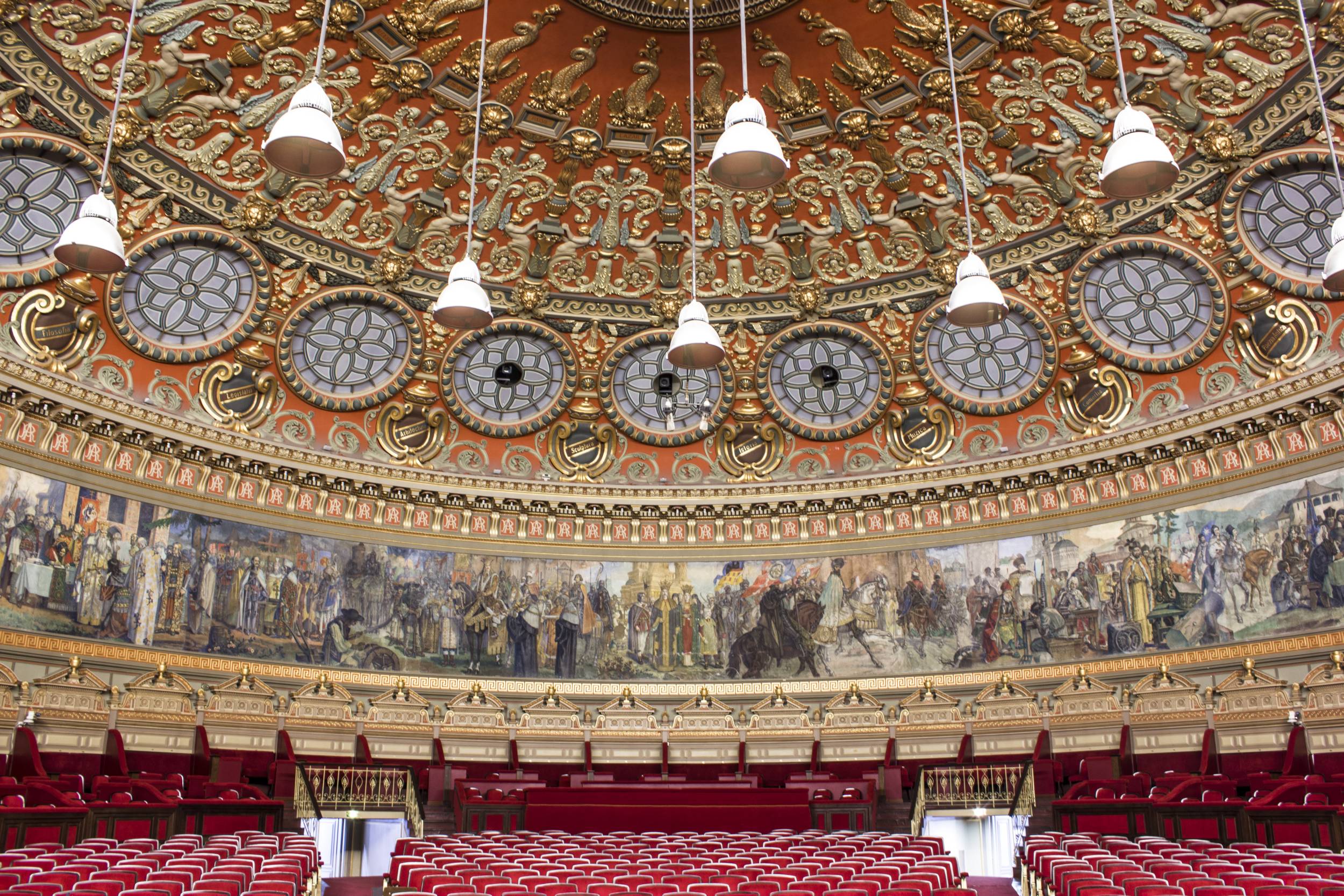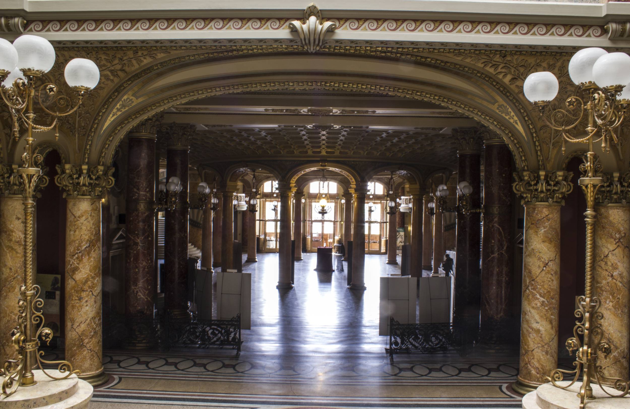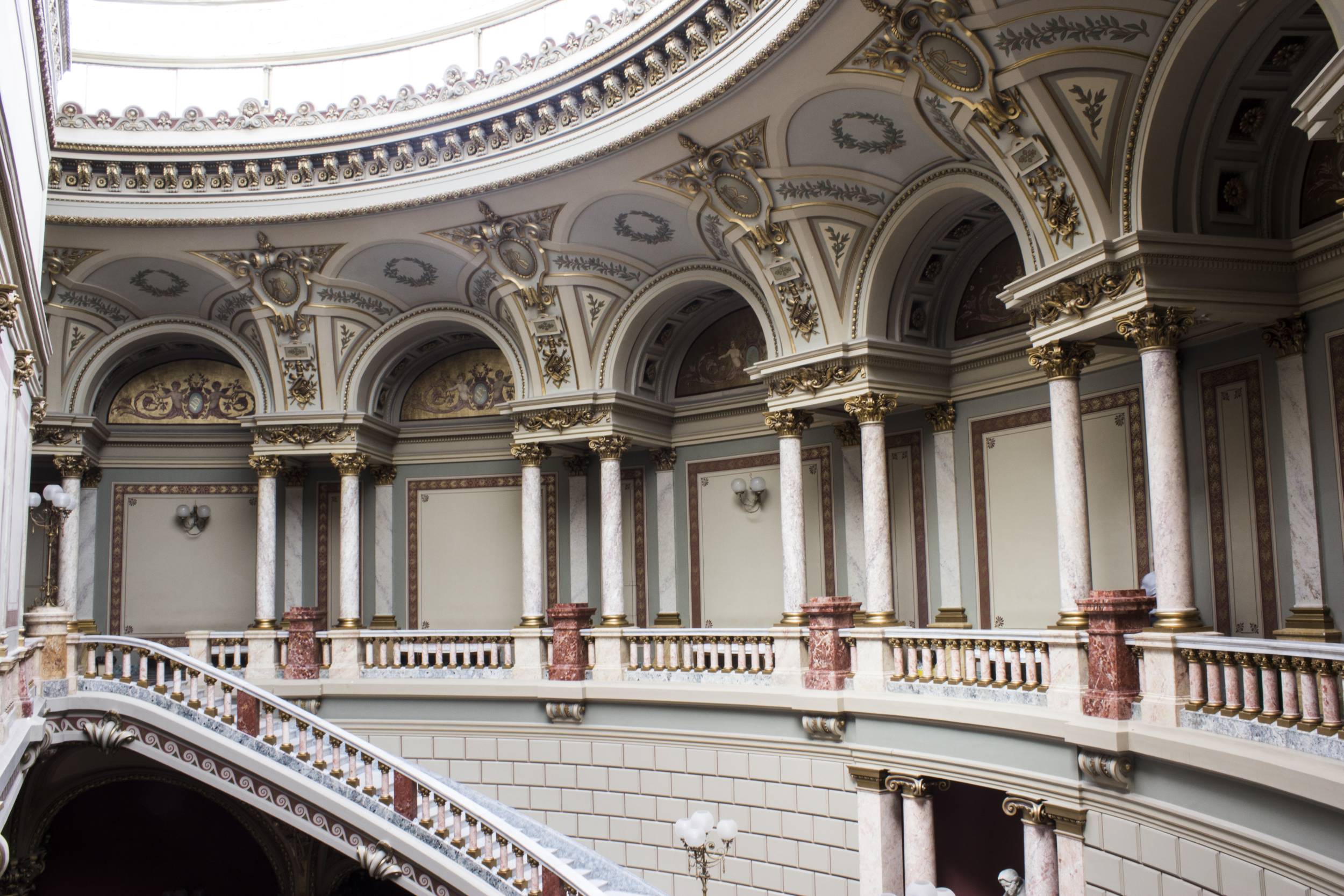 Patru scãri monumentale în spiralã de tip baroc din marmurã de Carrara ce gãzduiesc balcoane la etajul intermediar îi conduc pe vizitatori spre sala de concerte.