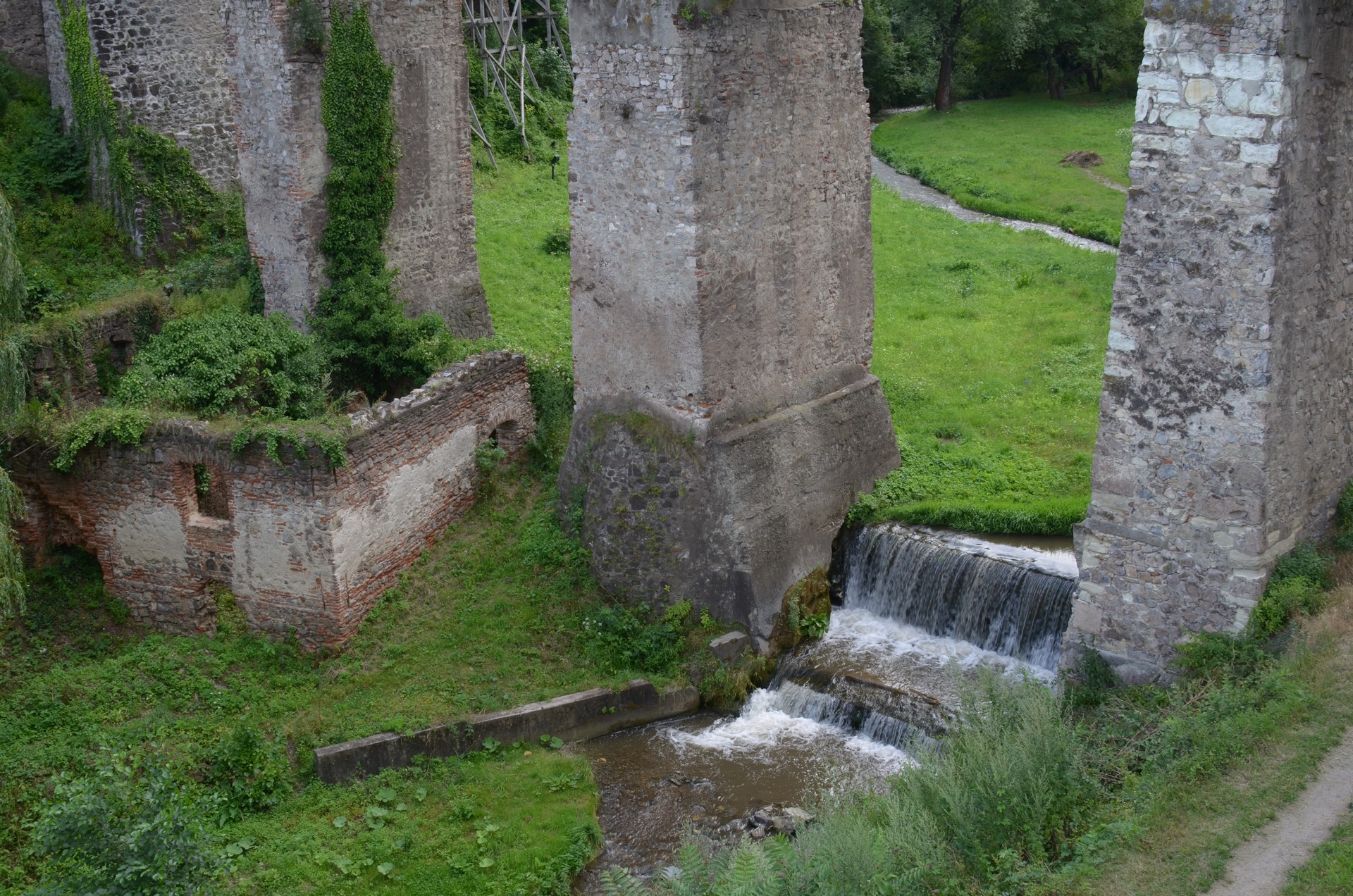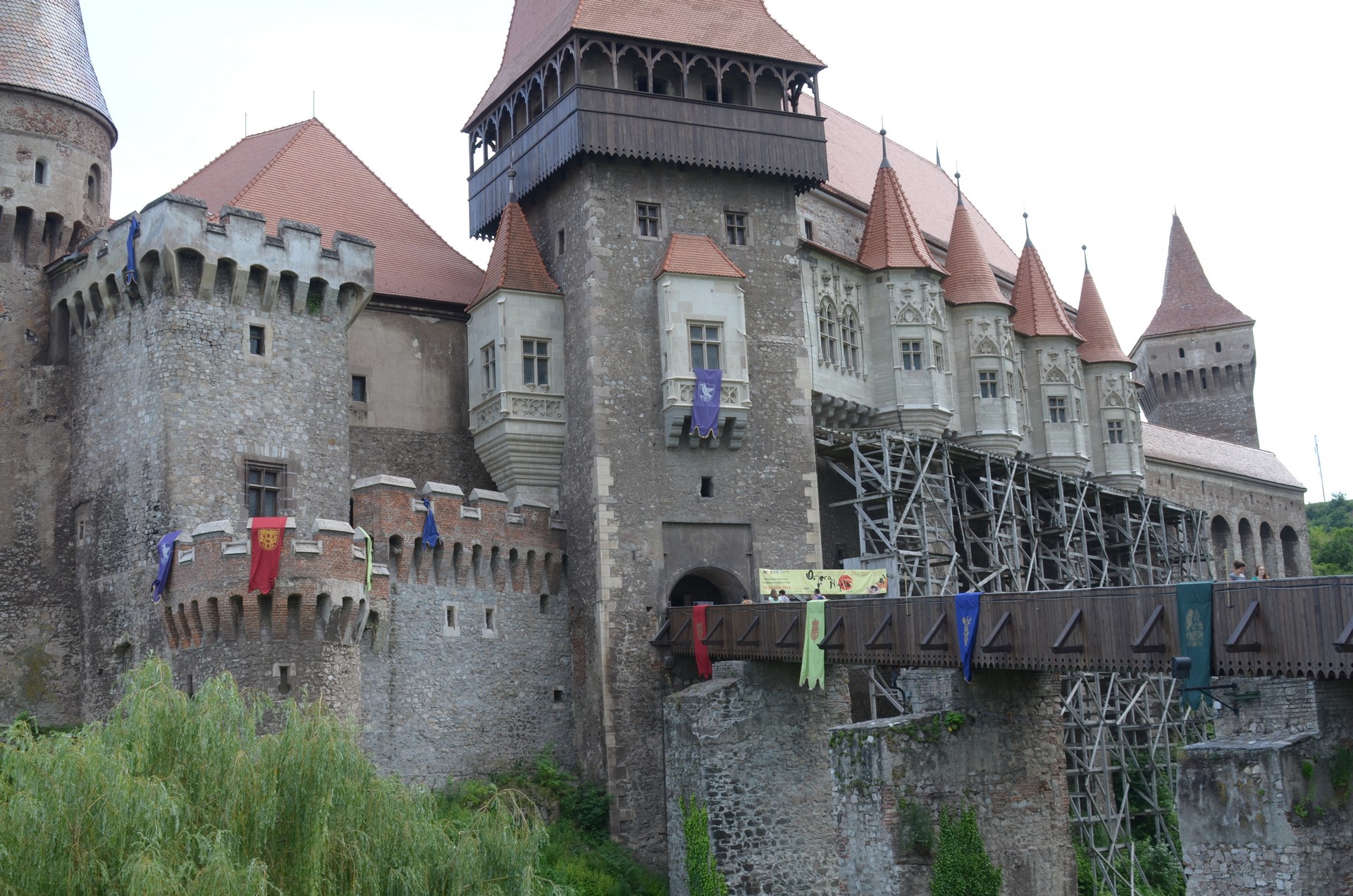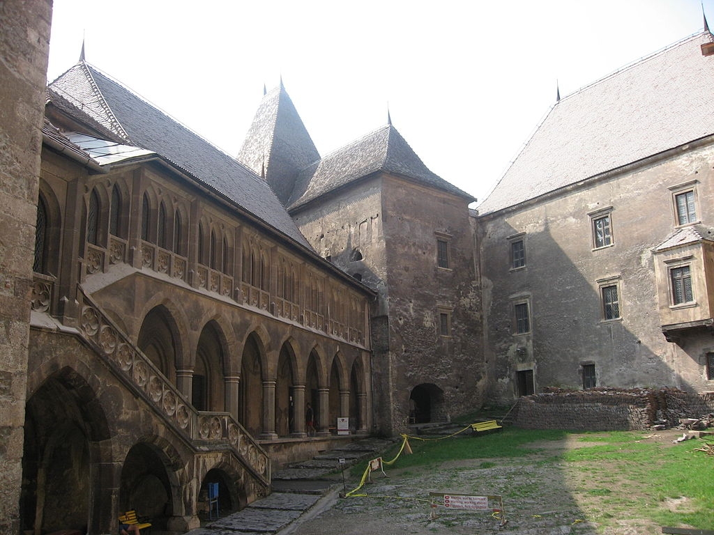 Castelul Corvinilor a fost extins de-a lungul timpului de către urmaşii lui Iancu de Hunedoara, printre care şi fiul său, Matei Corvin. Accesul în castel se face pe un pod de lemn, susţinut de patru piloni masivi de piatră, plasaţi în albia pârâului Zlasti, lăsând în urmă curtea husarilor şi nişa ce adăposteşte statuia Sfântului. Ioan de Nepomuk, protectorul podurilor şi al trecererilor peste apă.