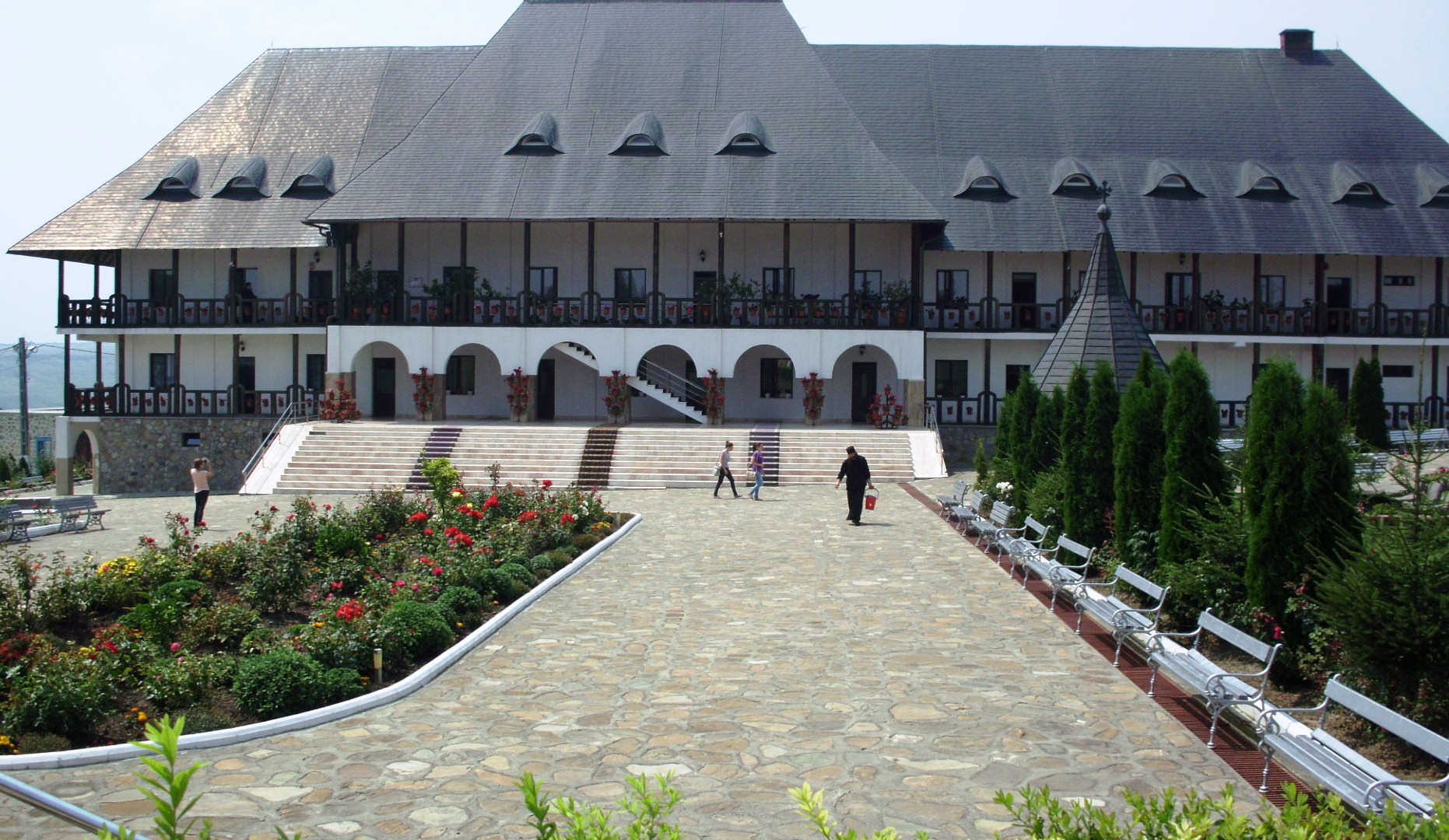 Urcuşul spre sfântul lăcaş este ca o Golgotă de lut. Drumul de legatură sfâşie câmpia lăsând în urmă satele îmbrăţişate de holdele de grâu, porumb şi floarea soarelui. Prin praful drumului trec căruţe, maşini, autobuze, grupuri de oameni oftând a nevoie, în lupta cu această adevărată provocare a naturii. Sus, chiar pe Dealul Hadâmbul, ţâşneşte spre cer silueta albă strălucitoare a mănăstirii, vestitul lăcaş monahal ajuns în ultima perioada în atenţia credincioşilor pentru nemaivăzutele miracole împlinite de cele patru icoane ce plâng cu lacrimi de mir între zidurile vechi de peste 350 de ani. Acolo lumea parcă se trage dintr-un alt aluat – cufundată în trăiri simple, căptuşită cu smerenie şi pace, o lume care poate fi observată, atent, numai printr-o perdea cerească. “De la intrare până în pragul bisericii, călcăm numai pe sfinţi”, spune stareţul Nicodim Gheorghiţă.