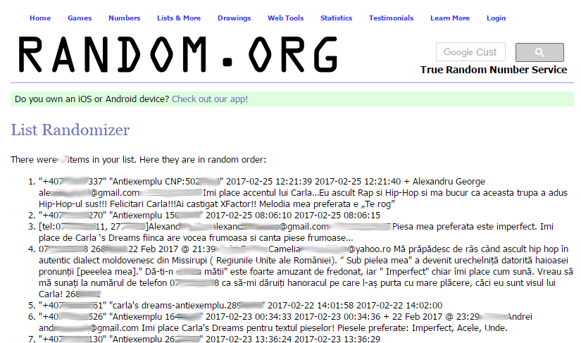 Cei doi câștigători vor desemnaţi prin tragere la sorți folosind site-ul https://www.random.org/lists/ (sau bilețele cu cifre, în cazul în care ar apărea probleme tehnice), astfel: primul de pe listă -premiul I, al doilea de pe listă -premiul al II-lea. Câștigătorul premiului I își poate alege mărimea hanoracului (unul este L, celălalt M). Doi ascultători pot participa la tragerea la sorți cu condiția să se anunțe (primii) la 0256 401805 până vineri 24 februarie la ora 12.