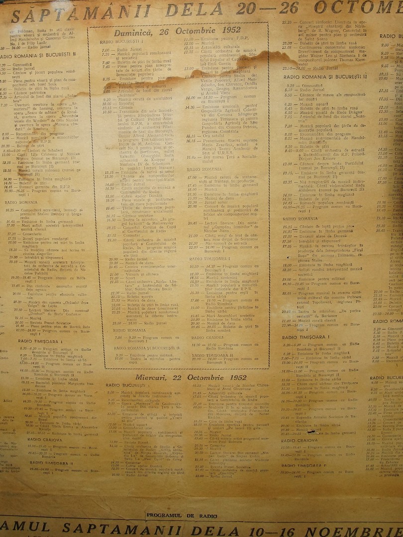 S-a vorbit despre emisiunile actuale, dar și despre cele de altădată. În sala de ședințe cei interesați despre începuturile transmisiunilor Radio România în vestul țării au putut admira o oglindă carea re pe spate un program radio din 1952 și care demonstrează că se transmiteau emisiuni pentru Timișoara … chiar și înainte de 5 mai 1955, cunoscută drept data primei noastre transmisiuni.