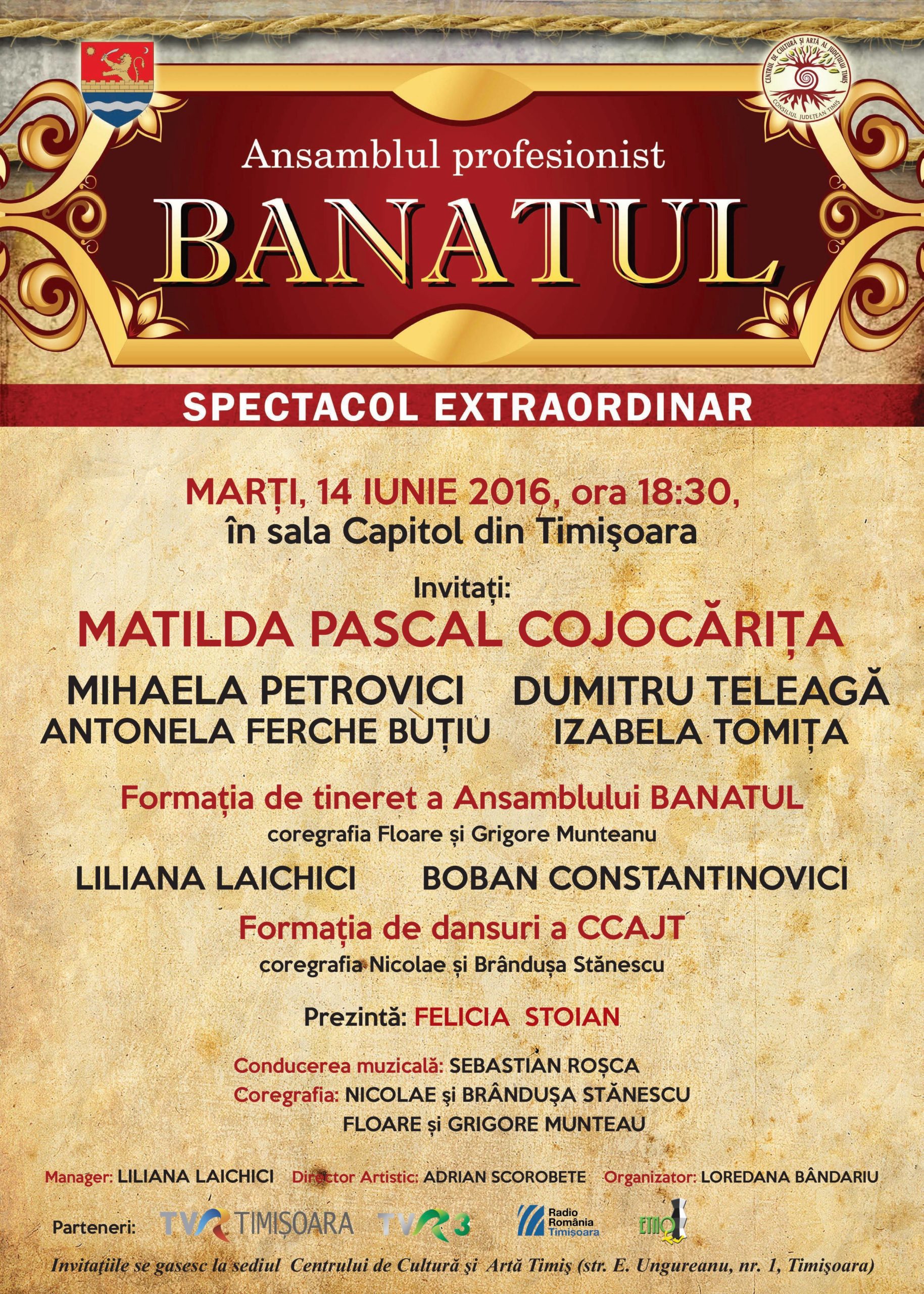Parada instrumentelor populare, Suită de dansuri de pe Valea Bistrei „Doi – Ardeleană – Doi”, moment muzical-coregrafic sârbesc, solişti vocali şi instrumentişti invitaţi, nume sonore în folclorul românesc, din Năsăud, Bihor, Oltenia, Moldova, Sibiu şi Banat sunt câteva dintre surprizele pregătite de Ansamblul profesionist „Banatul” din Timişoara pentru spectacolul în premieră care va avea loc la Sala Capitol, marţi, 14 iunie, de la ora 18:30.
