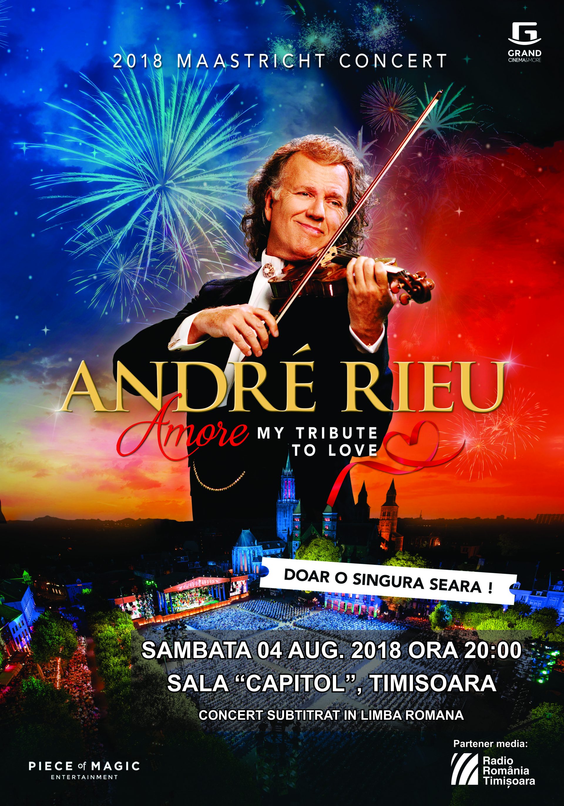 Concertul lui André Rieu de la Maastricht, orașul său natal, va fi proiectat la Timișoara, la Sala Capitol a Filarmonicii Banatul, sâmbătă, 4 august 2018, de la ora 20.00. Concertul din acest an celebrează iubirea.