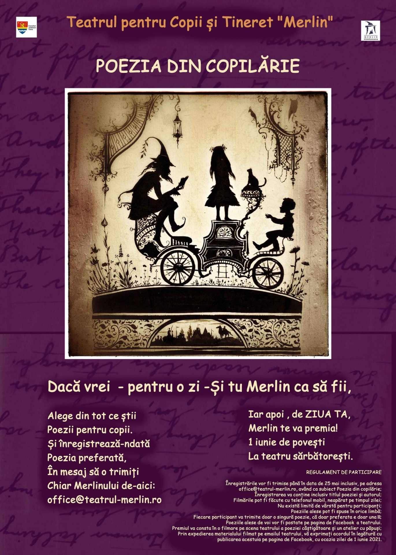 De asemenea, Teatrul Merlin continuă proiectul concurs Poezia din copilărie. Și pentru că și actorii au poezii preferate, acestea vor fi postate în fiecare zi de marți și vineri pe pagina de Facebook a Teatrului pentru Copii și Tineret „Merlin”.