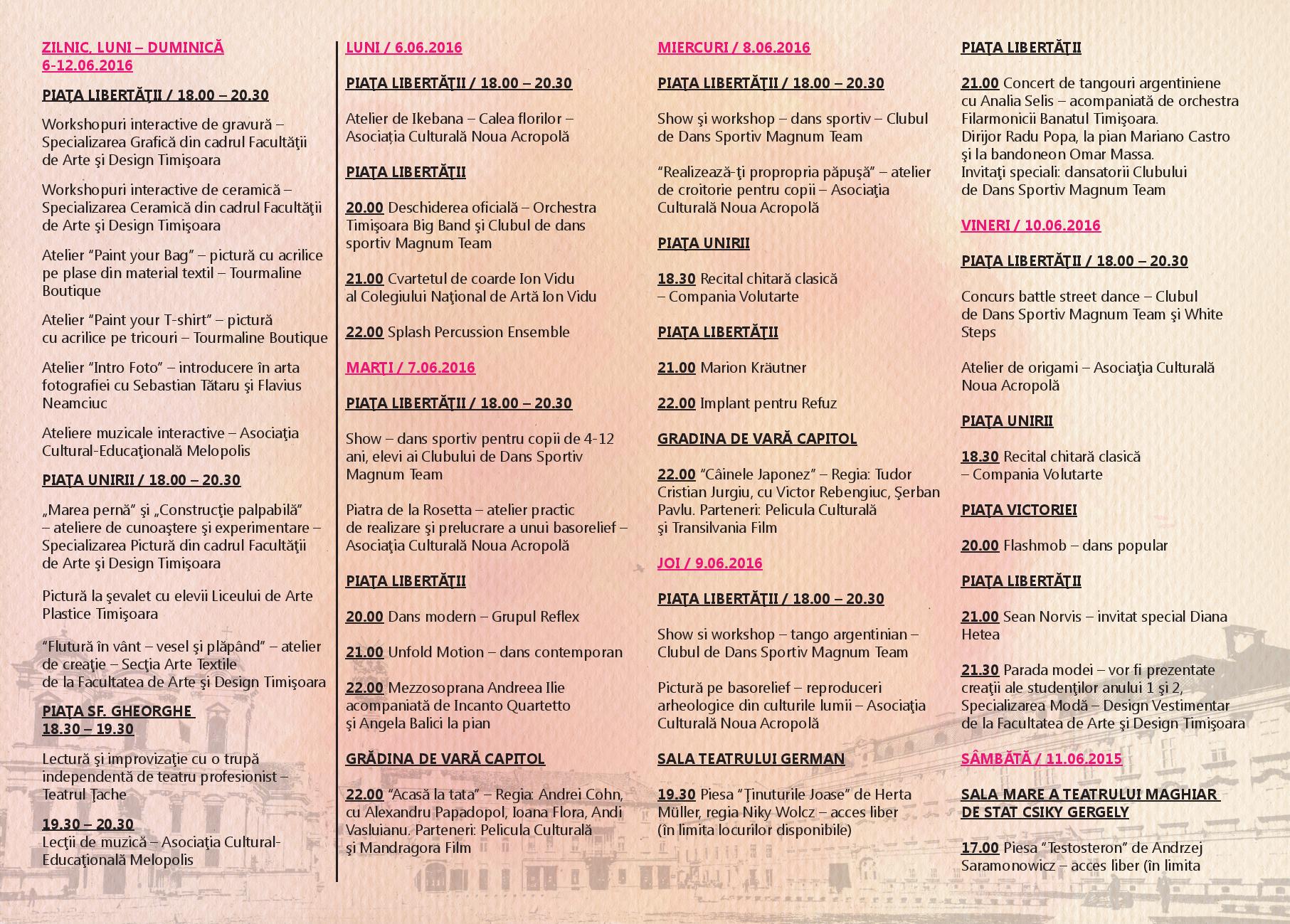 21.00 Concert de tangouri argentiniene cu Analia Selis – acompaniată de Orchestra Filarmonicii Banatul Timişoara. Dirijor Radu Popa, la pian Mariano Castro şi la bandoneon Omar Massa. Invitaţi speciali: dansatorii Clubului de Dans Sportiv Magnum Team