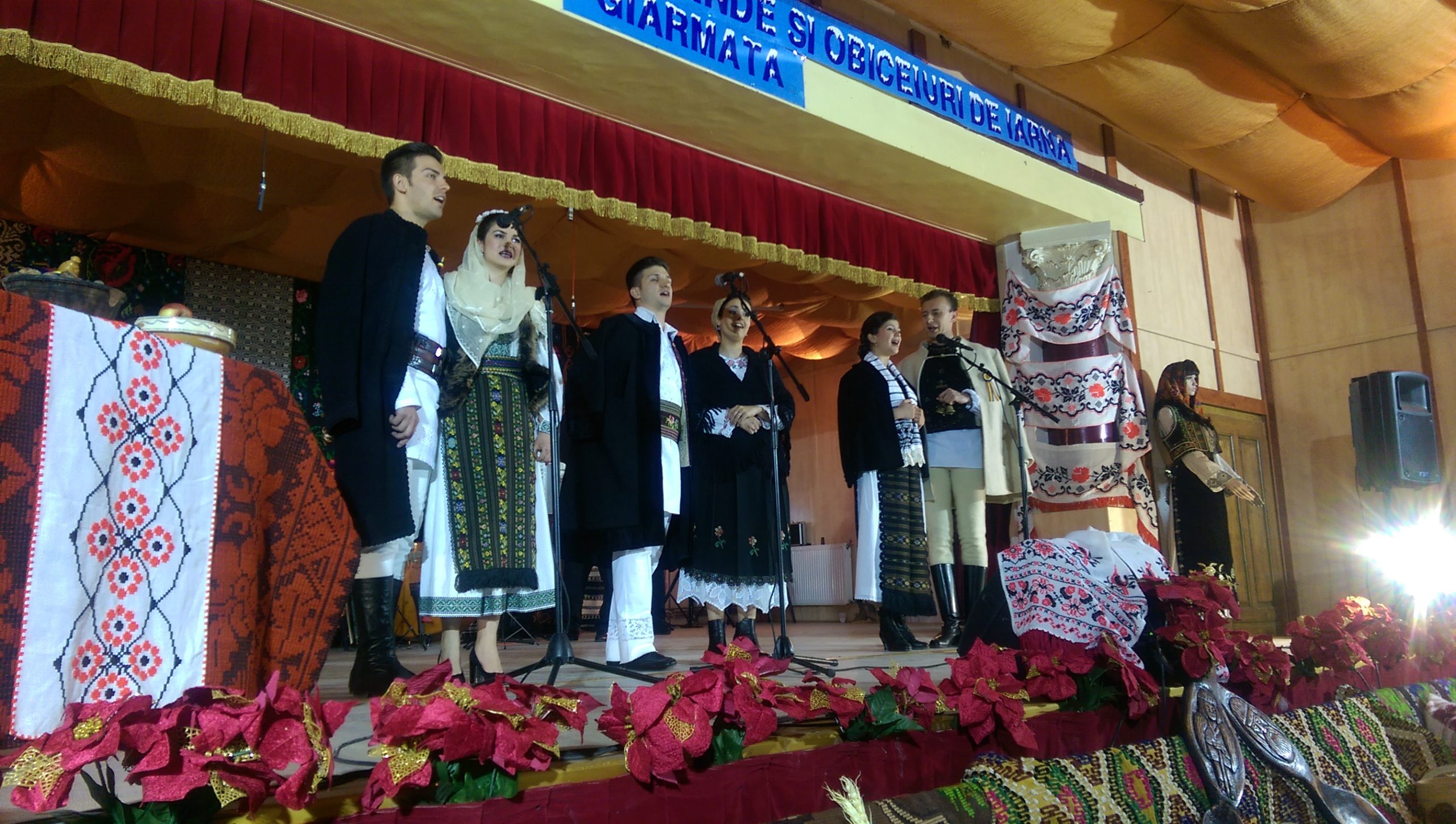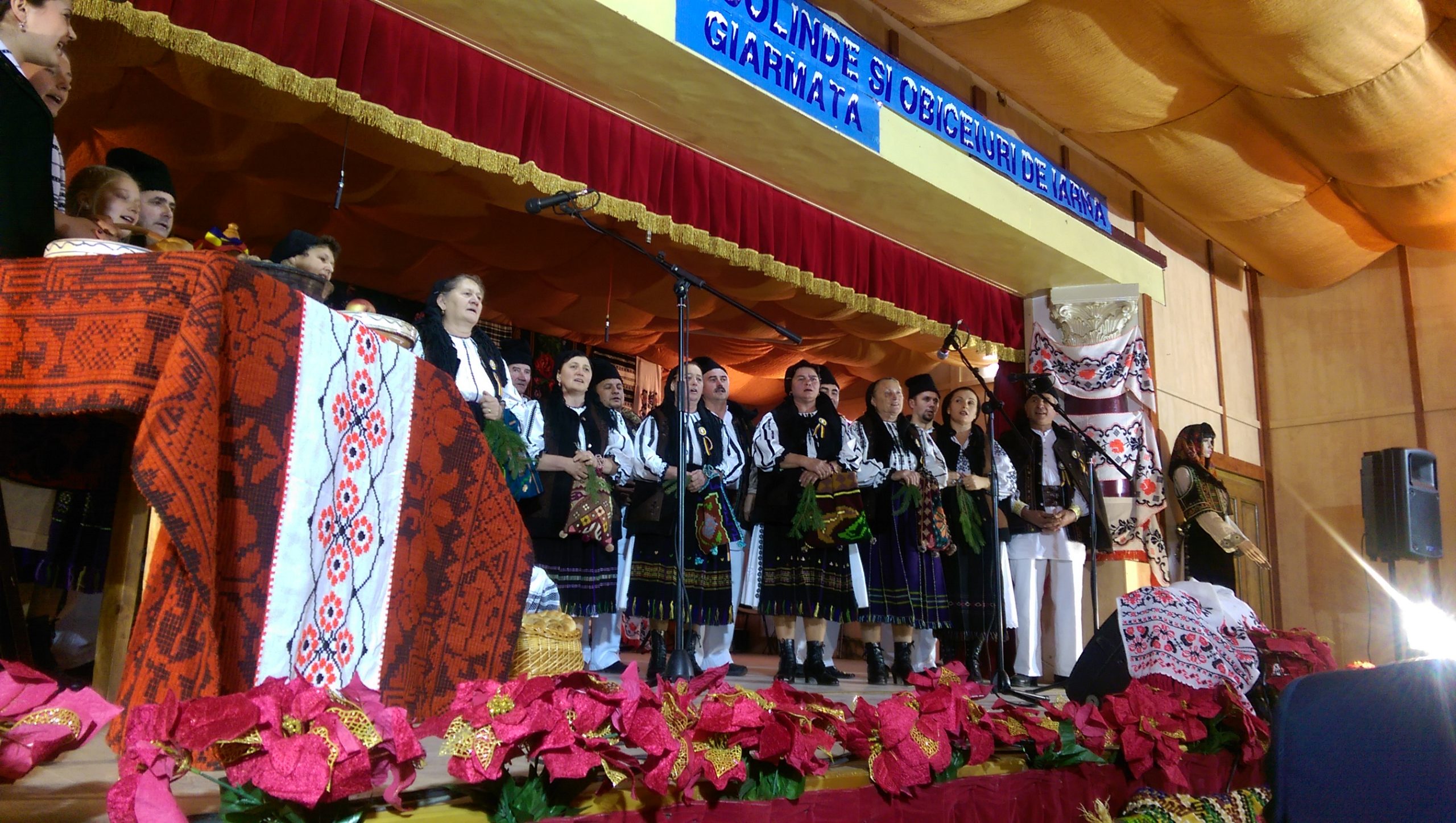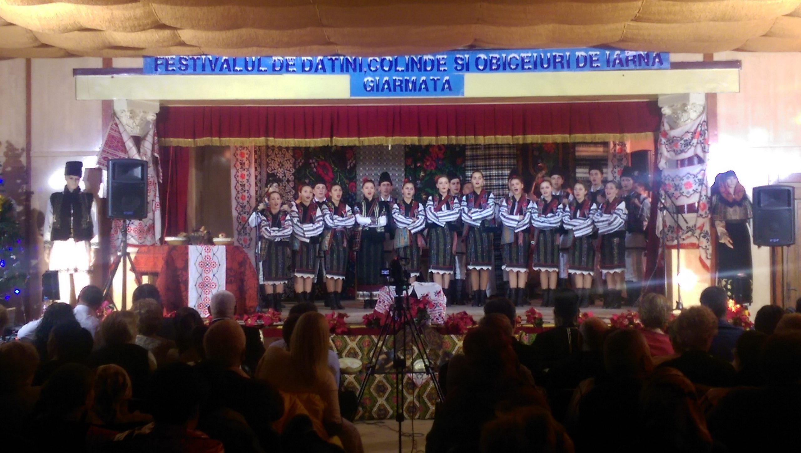 A V-a ediţie a Festivalului organizat de Asociaţia „Pro Datina”, Primăria şi Consiliul Local Giarmata s-a desfăşurat aseară la Casa de Cultură din localitate. Colindători din Ţara Haţegului, Ţinutul Hunedoarei şi-al Târnavelor, Ţara Făgăraşului, Bucovina, Maramureş, Ţara Moţilor, Gorj, de peste Prut, au fost primiţi cu mare drag şi aplauze prelungi de Ansamblul „Sânziene Bănăţene” din Giarmata care a aniversat, nu de mult, 10 de existenţă şi de publicul numeros. Colindele, datinile şi obiceiurile strămoşeşti au fost completate de cântecele populare aduse de tinerii interpreţi Ina Todoran, Tudor Furdui Iancu, Virginia Irimuş, Beatrice Bândoiu, Grigore Gherman şi bănăţeanul nostru Ciprian Pop, căruia, întreaga sală i-a cântat „Mulţi ani trăiască” de ziua lui. N-au lipsit jocurile populare, dubele, pluguşorul şi capra.