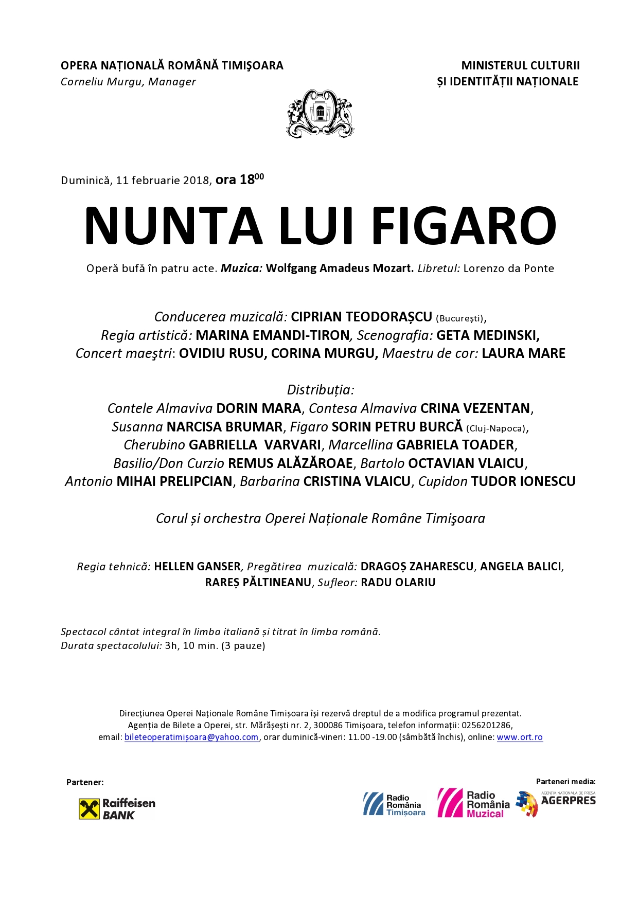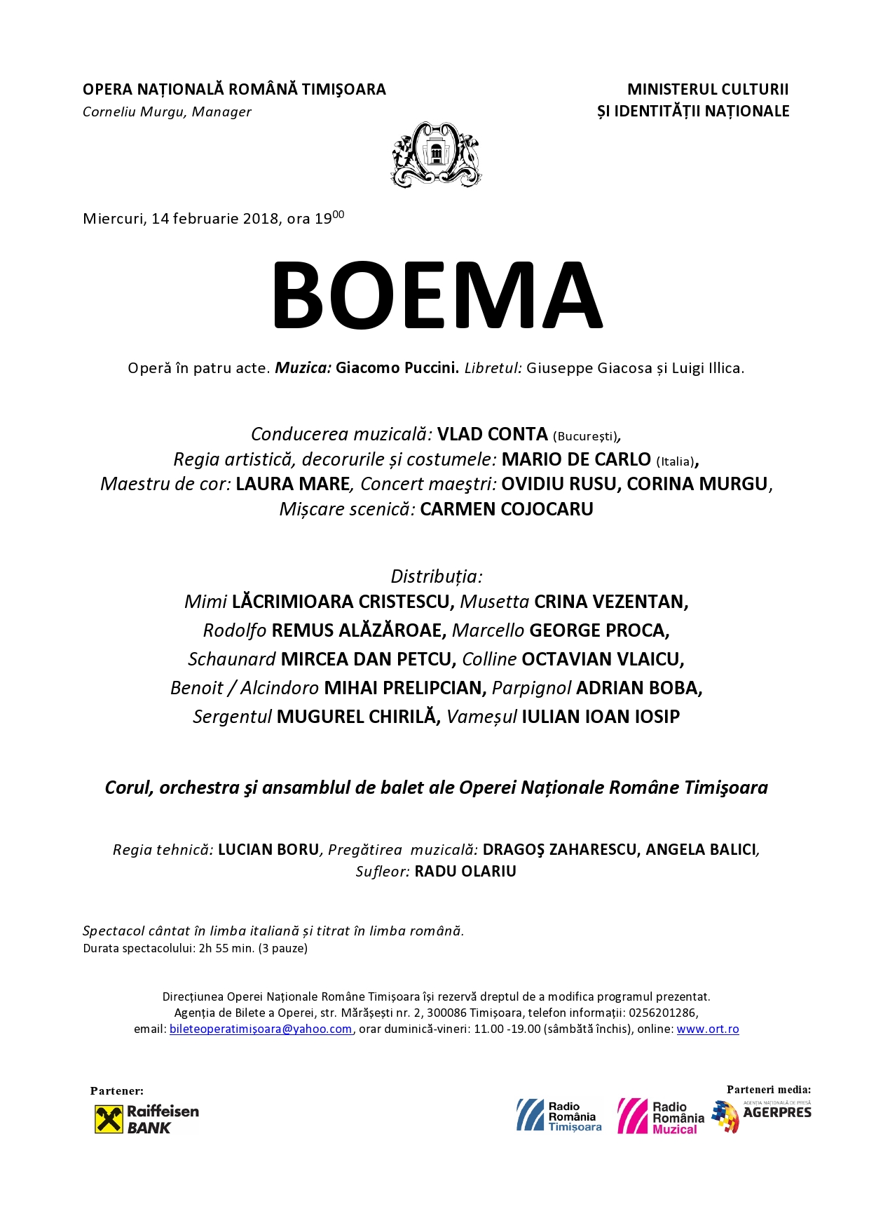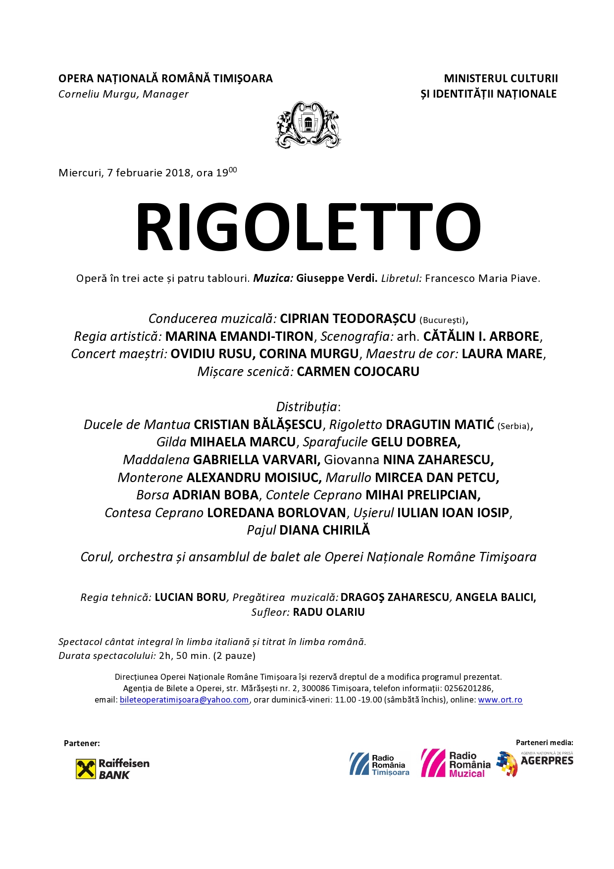 Spectacol de operă cântat în limba italiană și titrat în limba română.