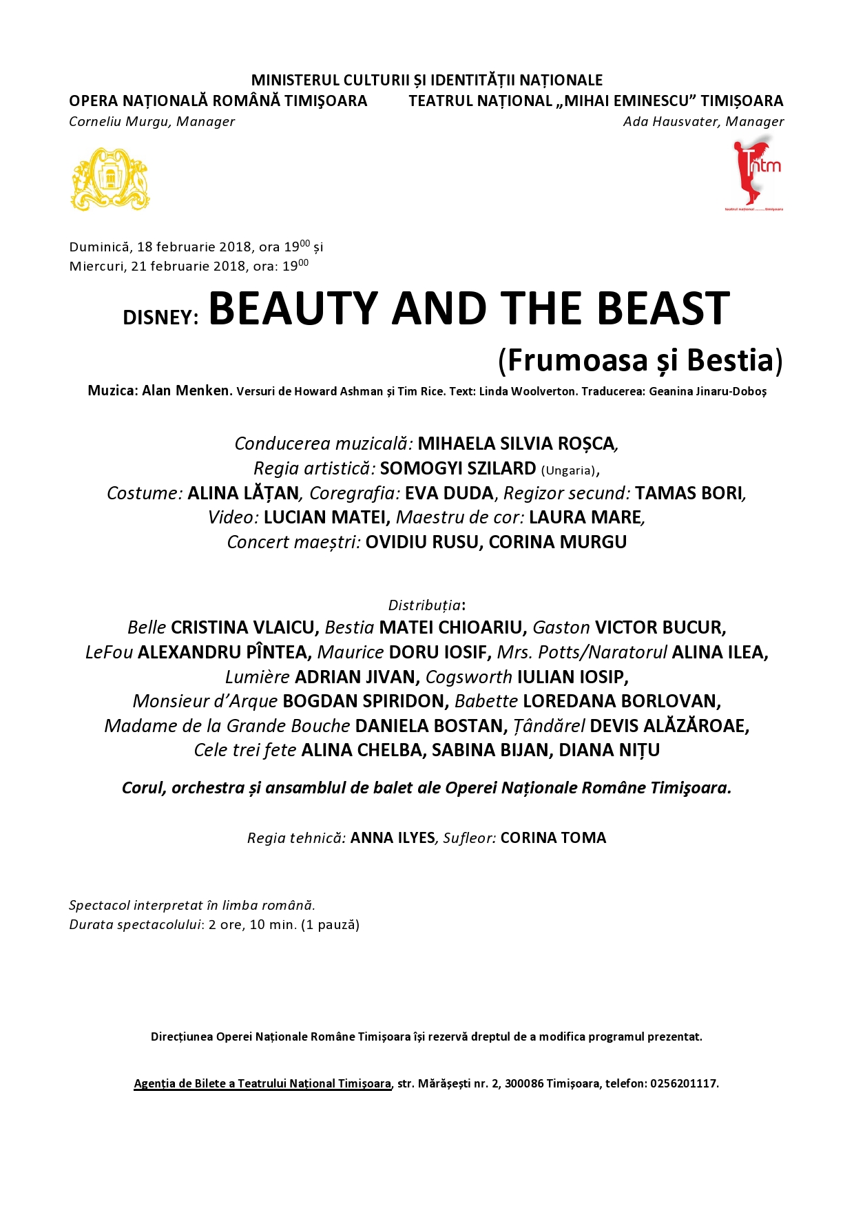 Biletele sunt puse în vânzare la Agenția de bilete a Teatrului Național din Timișoara, str. Mărășești nr. 2, telefon: 0256201117.