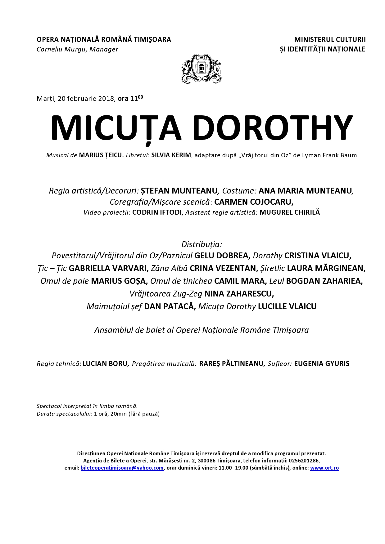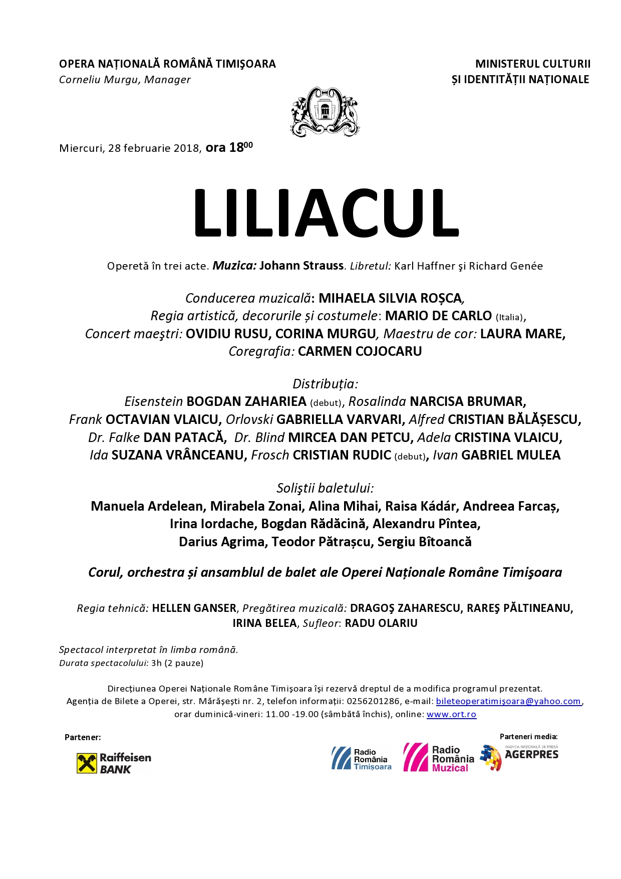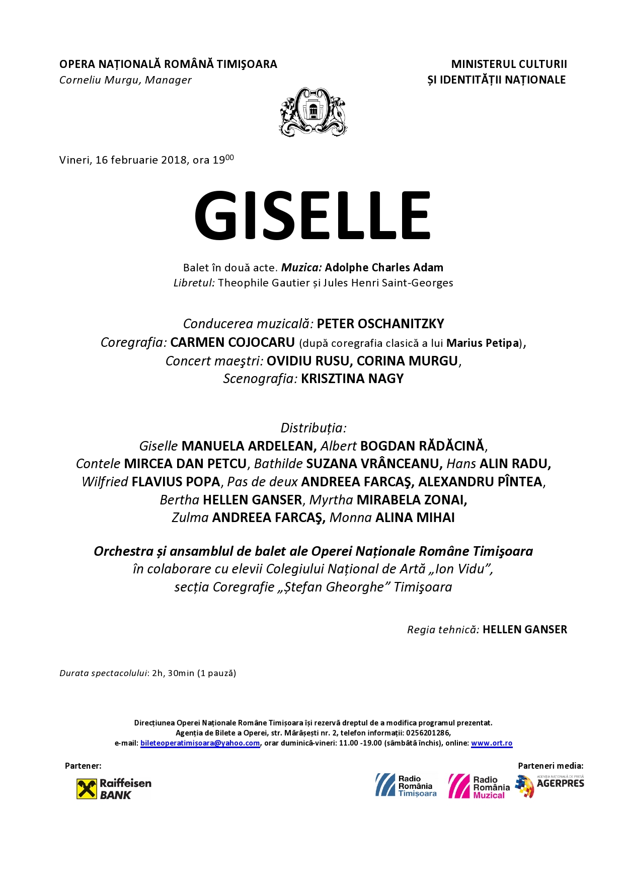 Biletele pot fi cumpărate de la casieria Operei: Str. Marașești nr.2, orar: de luni până vineri între orele 11.00 – 19.00. (sâmbăta închis), email: bileteoperatimisoara@yahoo.com,online: www.ort.ro. Rezervări: telefon 0256.20.12.86