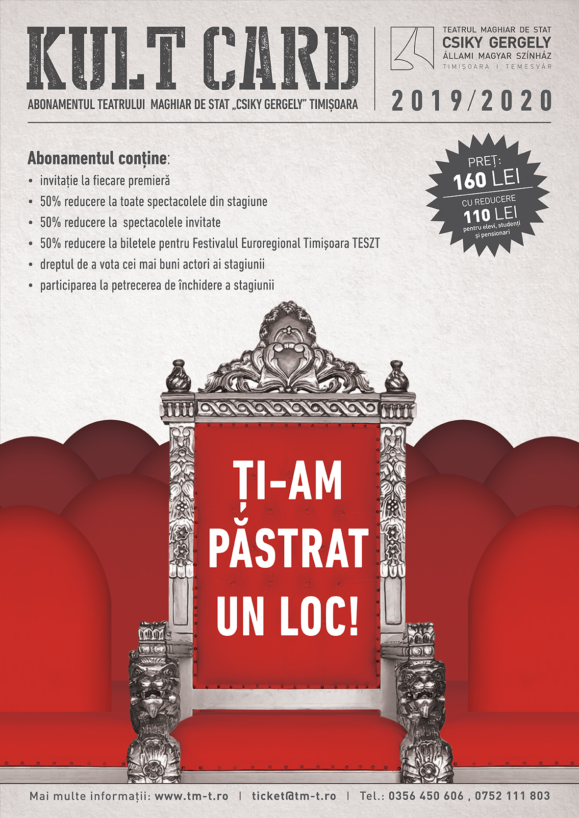 Teatrul Maghiar de Stat „Csiky Gergely” din Timișoara lansează Kult Card pentru întreaga stagiune 2019/2020. Autentic brand al solidarității culturale, abonamentul Kult Card, reprezintă concret și cuantificabil multiculturitatea și cultura, valori esențiale ale Timișoarei și Banatului.