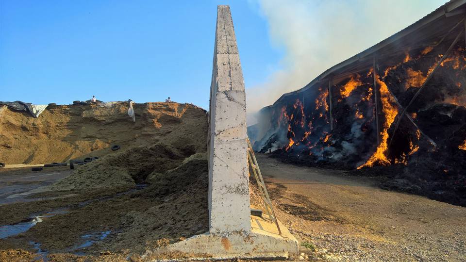 Incendiul se manifestă cu ardere generalizată pe o suprafaţă de aproximativ 6.000 de metri pătraţi ai depozitului în care se află 3.600 de baloţi mari de fân şi paie. Există pericolul ca incendiul să se propage la două grajduri şi la o staţie de biogaz. Între timp, 400 de vaci au fost evacuate din calea flăcărilor.
