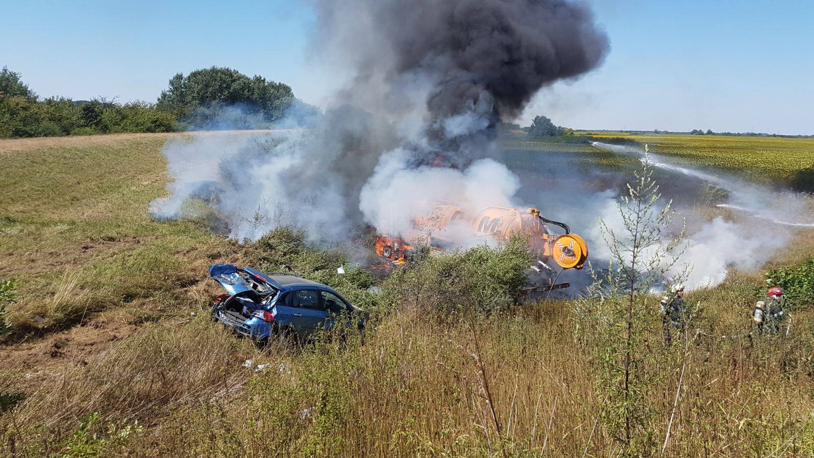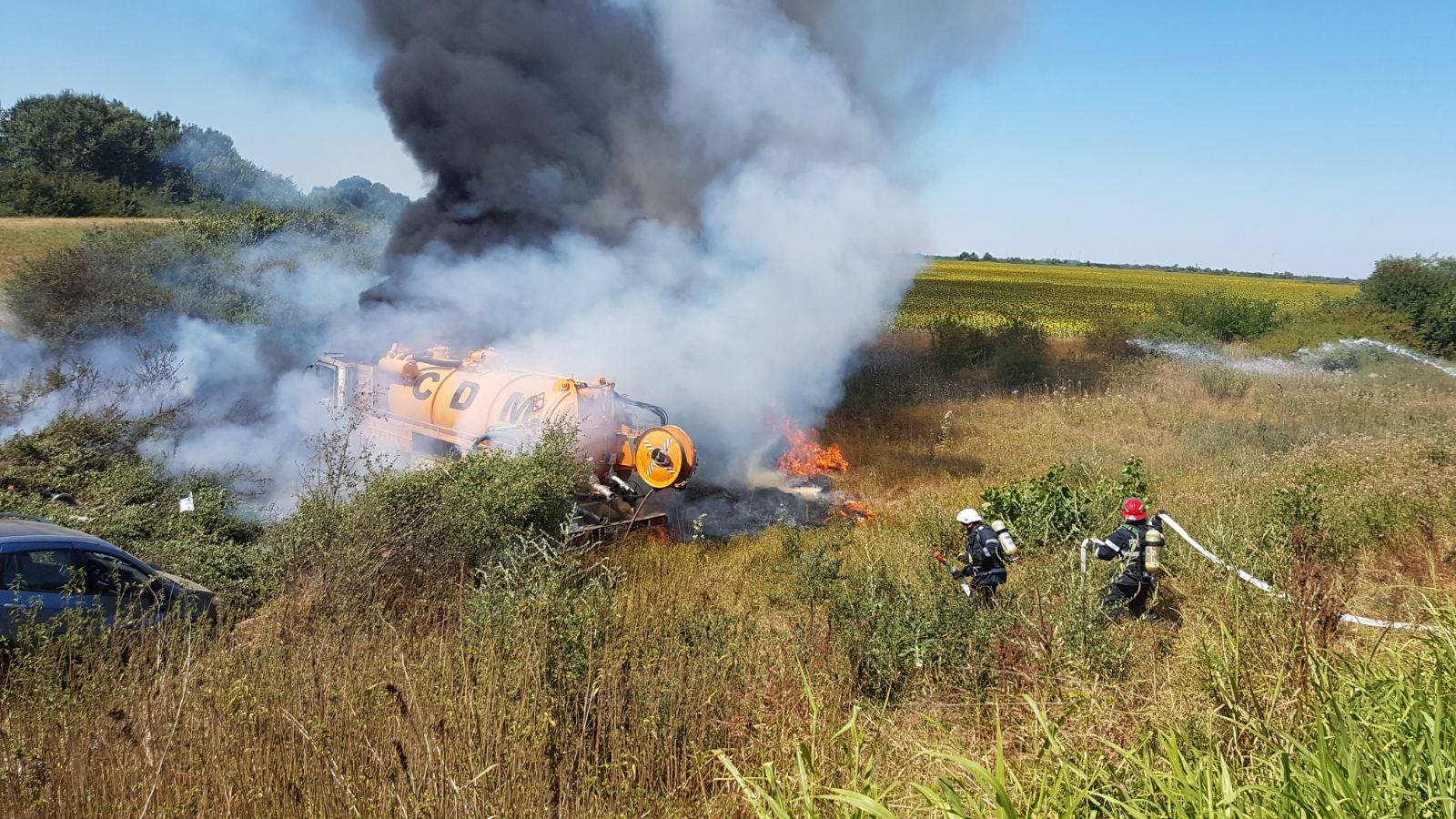 Echipele Inspectoratului pentru Situații de Urgență au fost solicitate să intervină la la un accident în care au fost implicate o autovidanjă, un microbuz de transport marfă și un autoturism. În urma impactului, autovidanja a părăsit carosabilul și a luat foc.