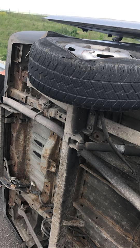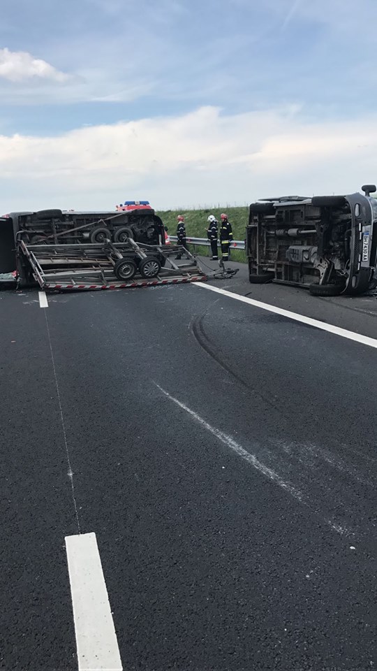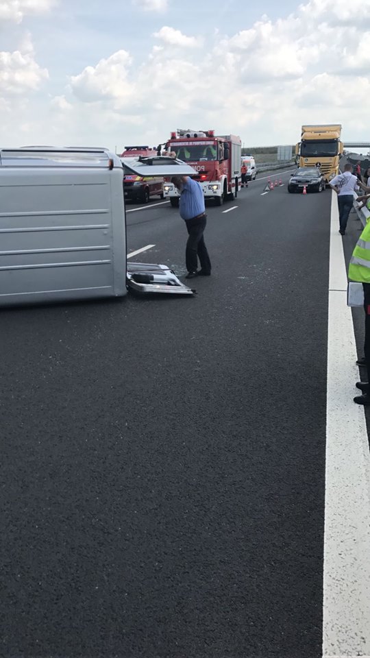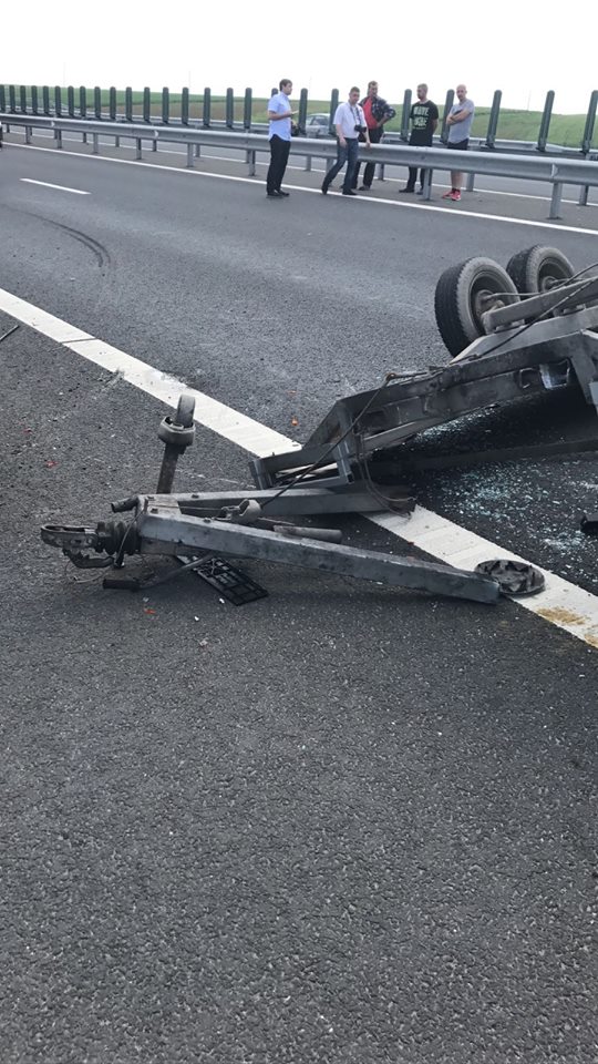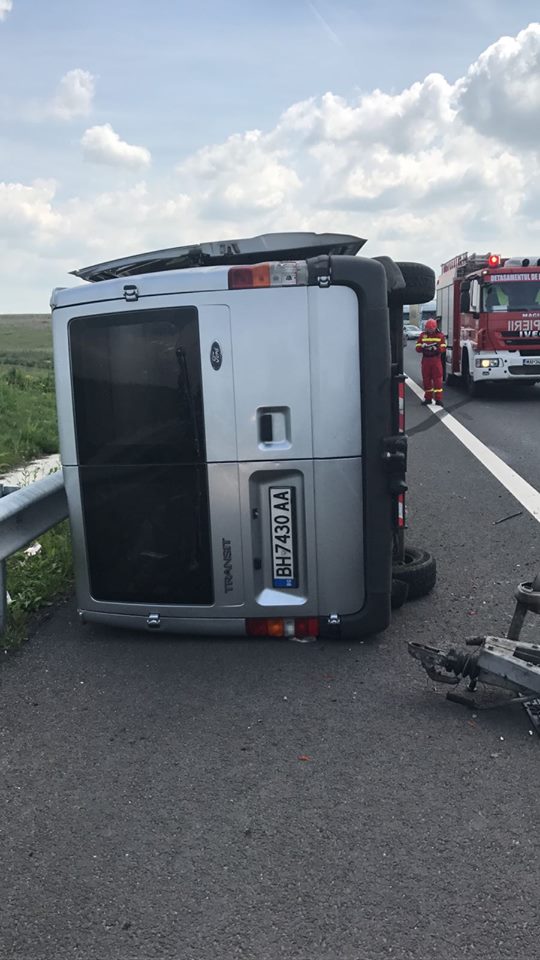 Un microbuz cu numere de Bulgaria se îndrepta spre Timişoara, având ataşată o platformă pe care transporta un alt microbuz. În urma exploziei unui cauciuc al microbuzului, cele două autoturisme s-au răsturnat pe șosea. În microbuz se aflau șapte adulți și un copil. În urma accidentului doar o femeie, în vârstă de 67 de ani, a necesitat transportul la spital, acuzând dureri în zona toracelui.