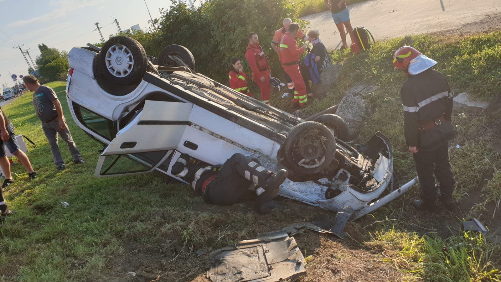 Două persoane au ajuns la spital și o mașină s-a răsturnat în urma unui accident produs pe Calea Șagului. Traficul la intrarea în Timișoara a fost îngreunat câteva zeci de minute.