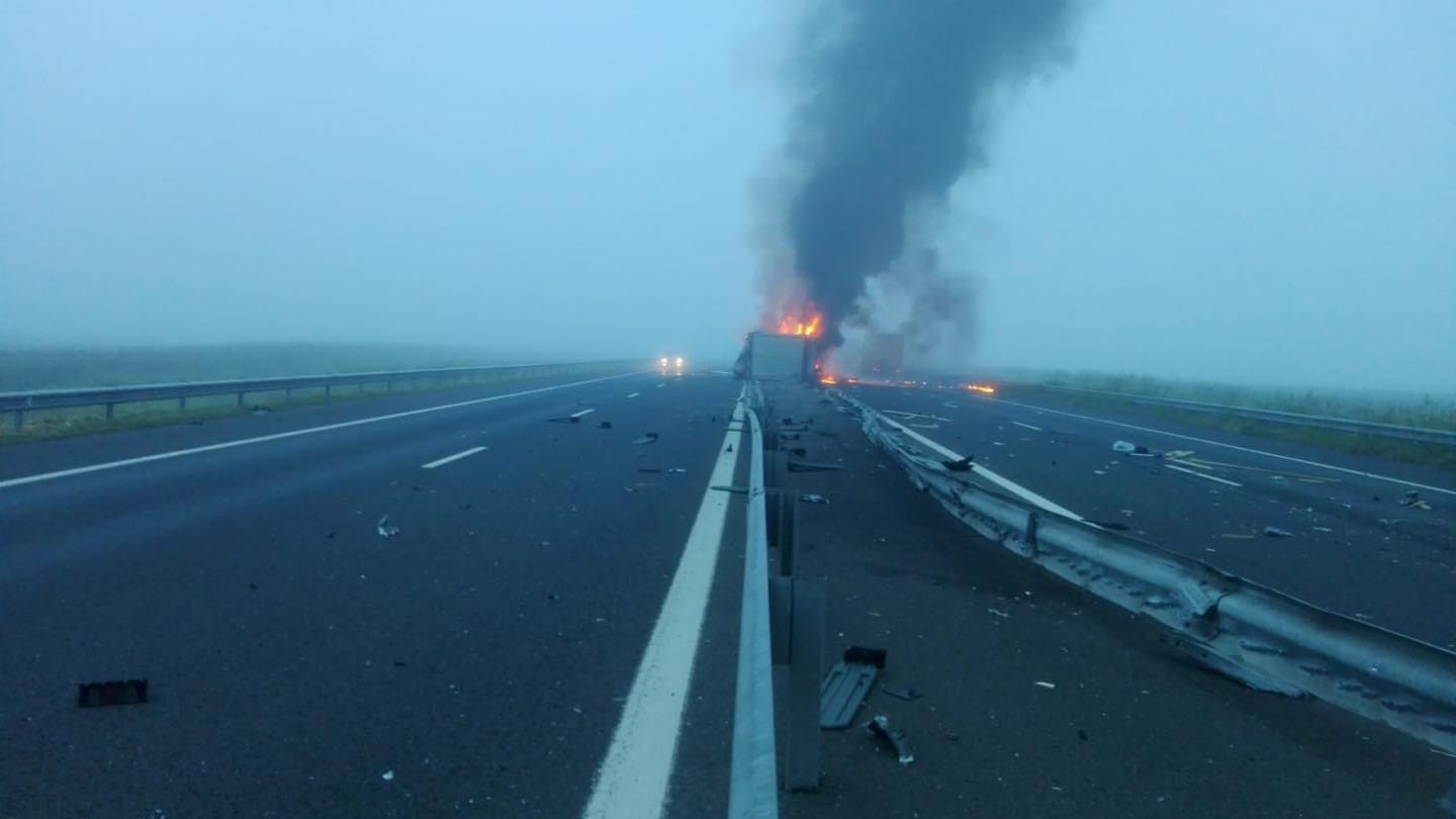 Centrul Info Trafic al Poliției Române anunță că șoferul unui autotren a pierdut controlul direțciei, a acroșat două autocamioane staționate pe banda de urgență, s-a răsturnat pe glisiera mediană, după care a luat foc. Nu s-au înregistrat victime.