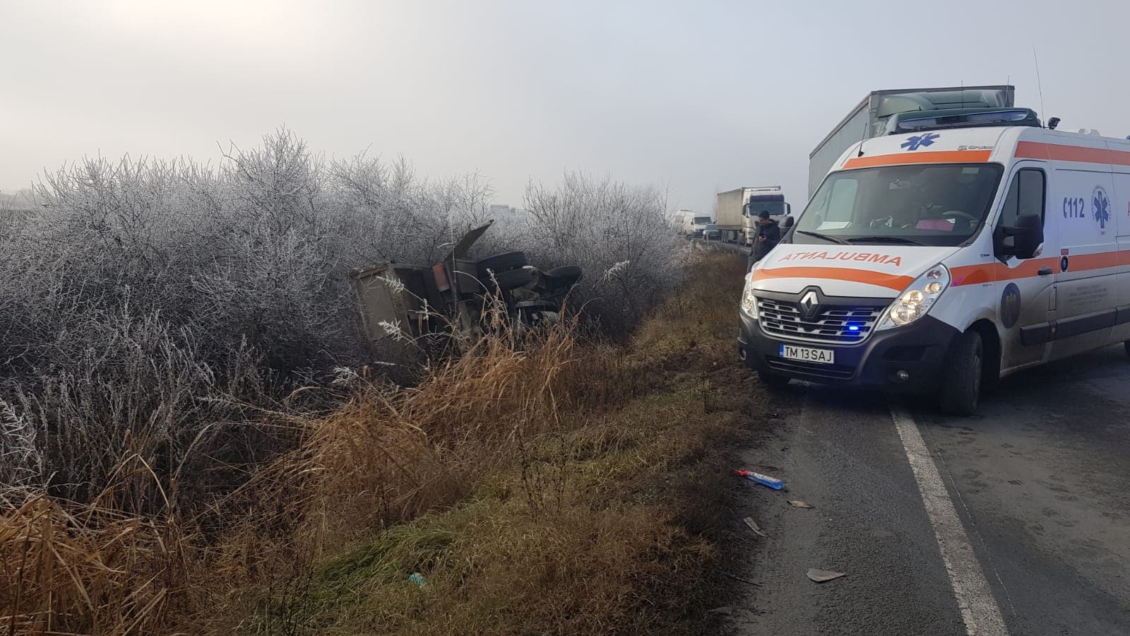 Potrivit polițiștilor, conducătoarea autoturismului circula dinspre Timișoara spre Lugoj și, la o curbă, a intrat pe contrasens unde s-a ciocnit de autoutilitara care s-a răsturnat în afara carosabilului.