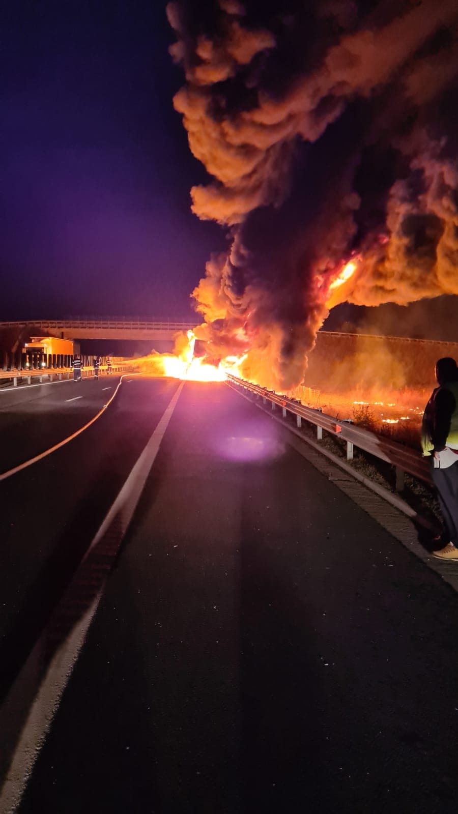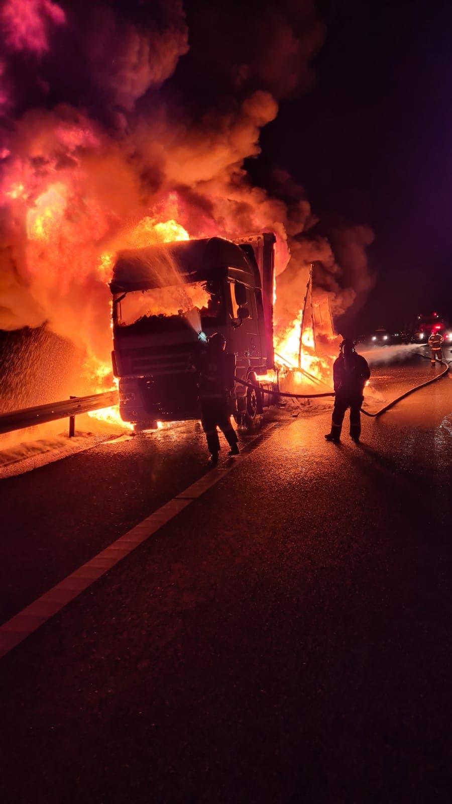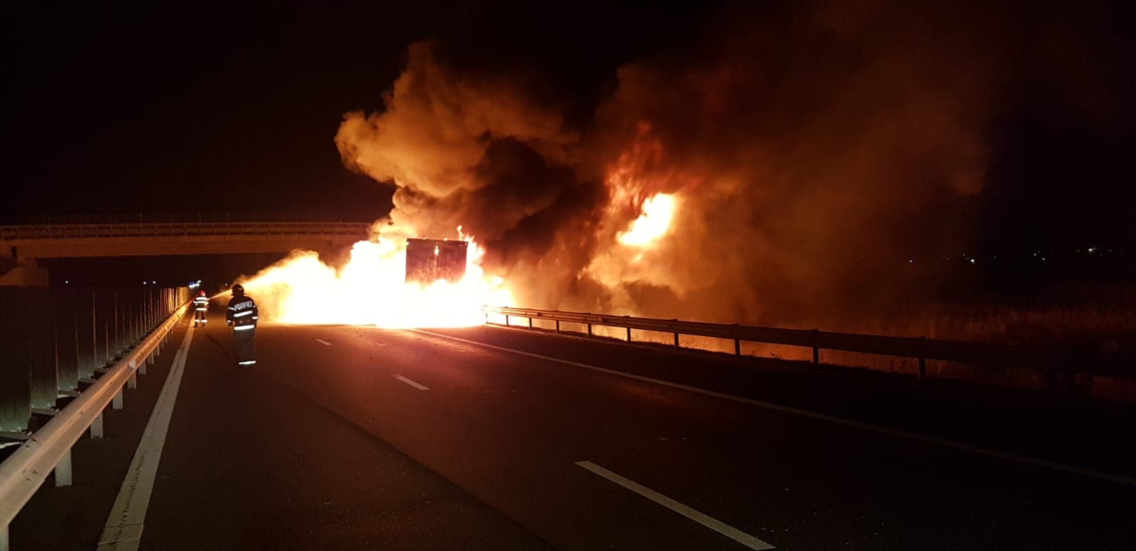 Incidentul s-a petrecut pe sensul de mers Timișoara – Lugoj al autostrăzii A1. Ansamblul rutier a fost cuprins de flăcări pe banda de urgență la kilometrul 488.