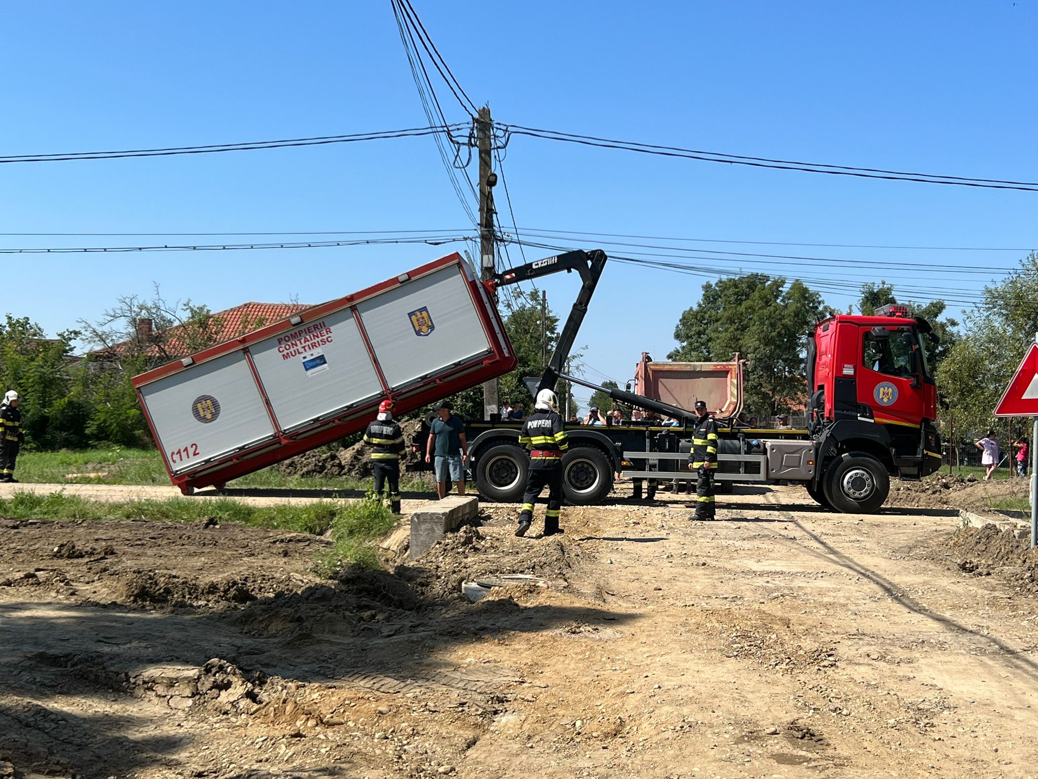 La faţa locului au fost mobilizate două autospeciale de stingere, un autocamion cu container multirisc, două buldoexcavatoare şi o ambulanţă SMURD cu medic.