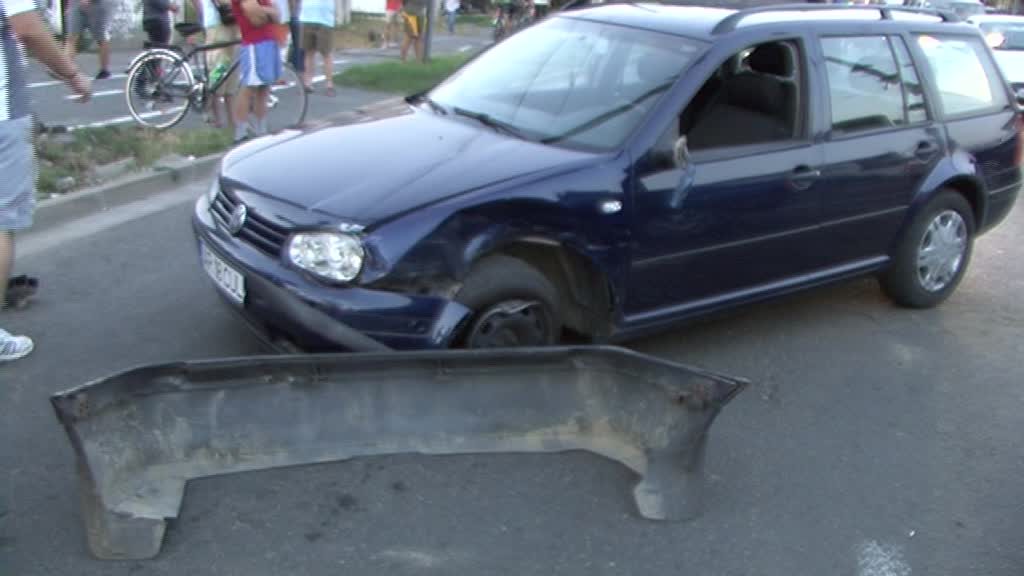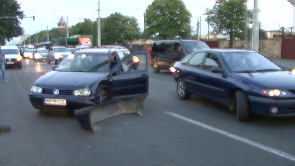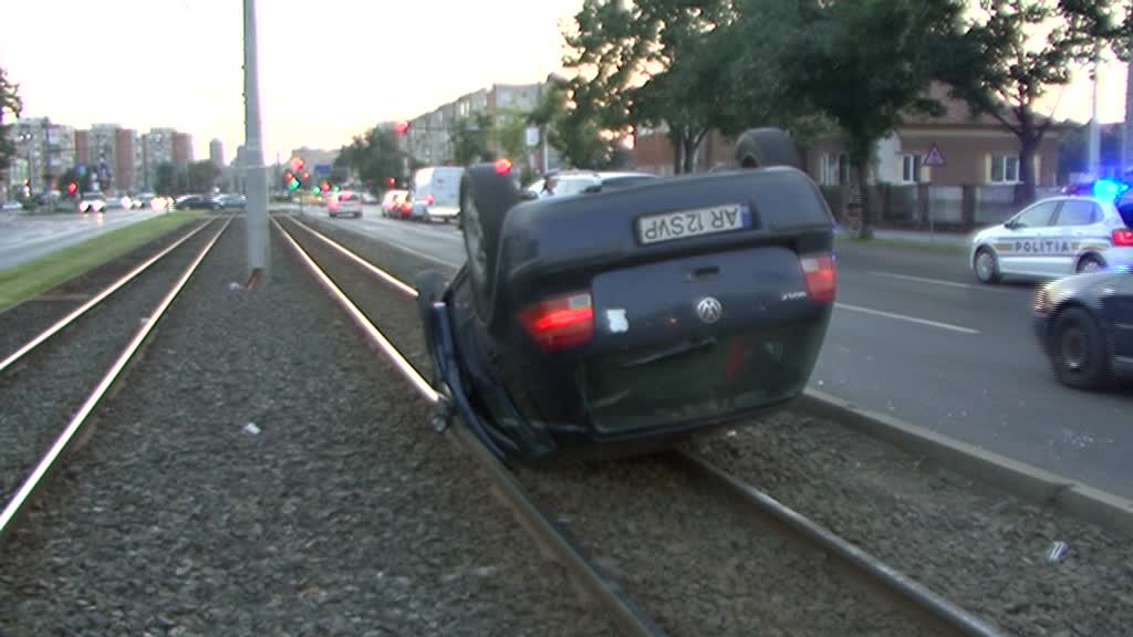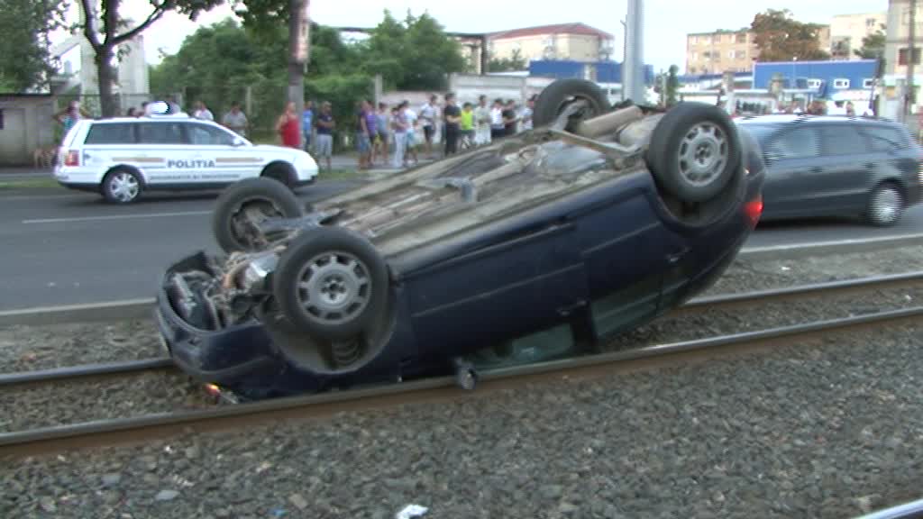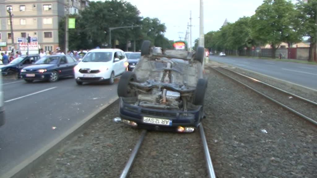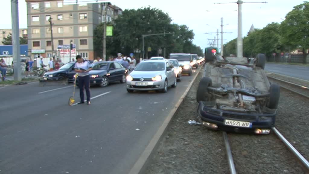 Conform martorilor, o mașină care circula cu viteză a acroșat un alt autoturism care s-a răsturnat pe liniile de tramvai. Șoferii altor două mașini nu au mai putut evita impactul și au intrat în coliziune.