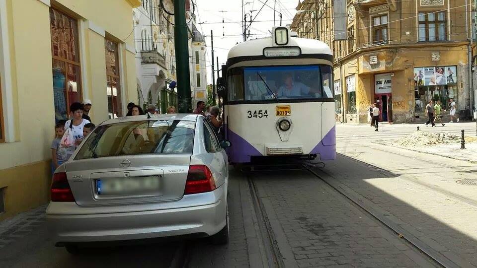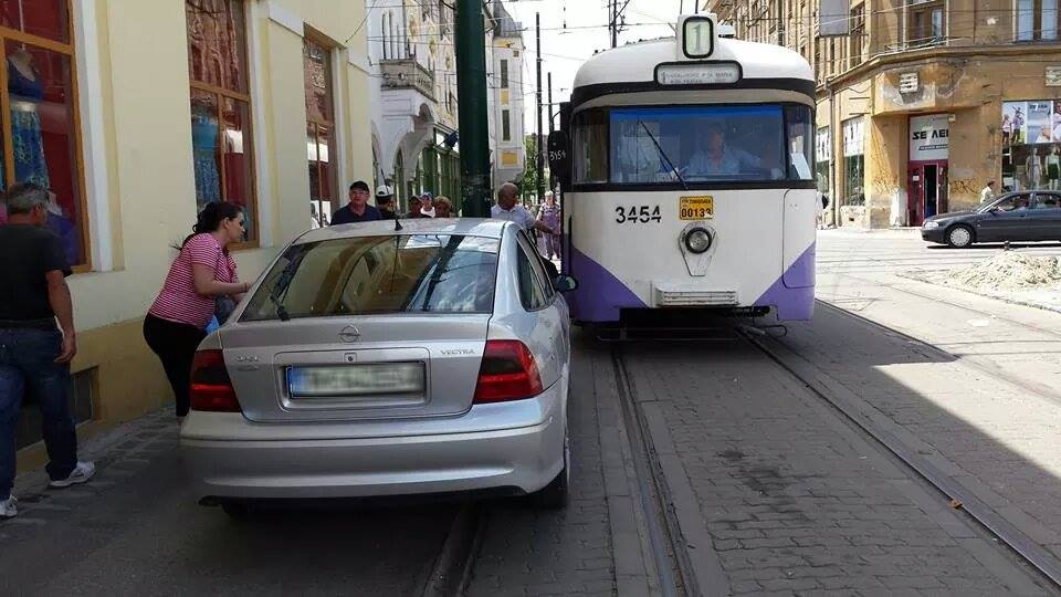 Circulaţia tramvaielor, blocată de un autoturism parcat neregulamentar