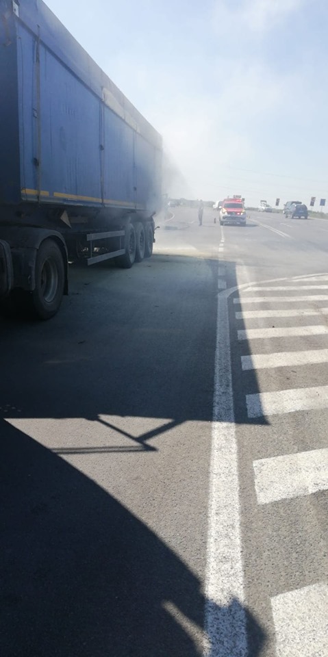 Un TIR încărcat cu îngrăşăminte pe bază de azotat de amoniu a avut o explozie la roata din spate dreapta, în timp ce se deplasa pe DN 69, dinspre Timişoara spre Arad, pe raza localităţii Sânandrei.