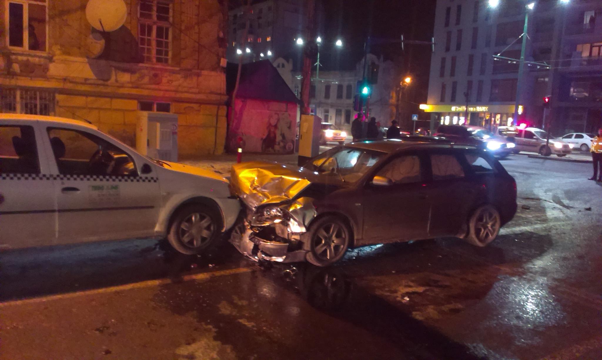 Conform primelor informaţii, șoferul unui Audi a încercat să vireze la dreapta, de pe strada Ștefan cel Mare pe Bd. Eroilor. Mașina a acroșat însă un autoturism marca Volkswagen Passat, al cărui șofer vira la stânga de pe Calea Buziașului pe Eroilor. În urma coliziunii, autoturismul Passat a fost proiectat într-o clădire, în timp ce automobilul marca Audi a acroșat un taximetru aflat la semafor.