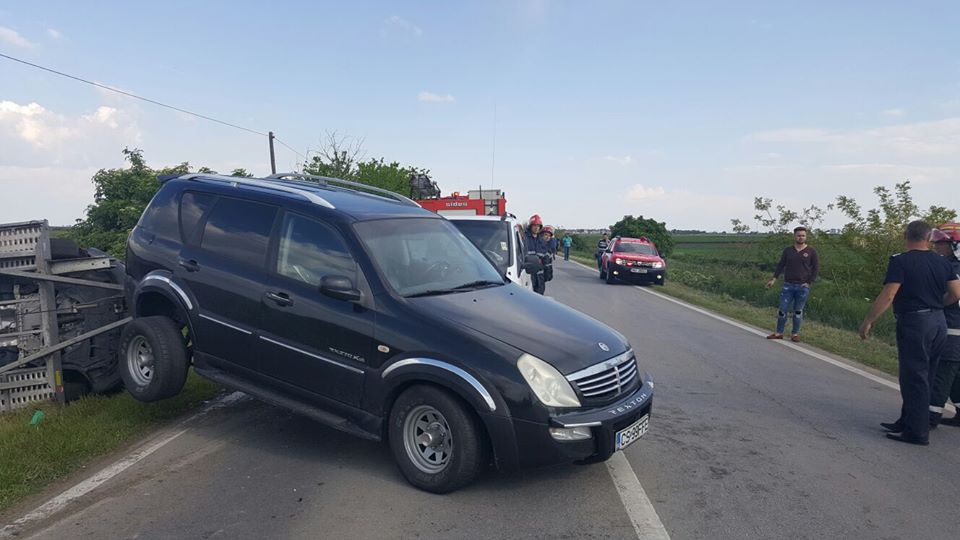 FOTO / Accident în Timiș. Un autoturism de teren s-a izbit de un microbuz cu pasageri