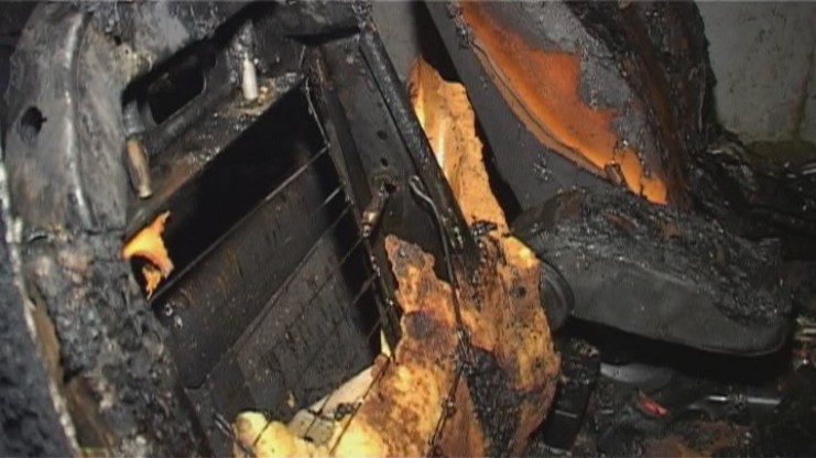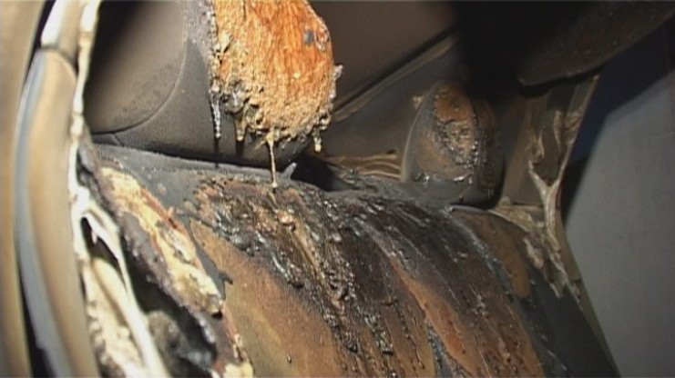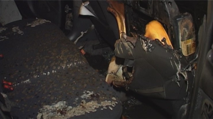 În interiorul mașinii se vede piatra cu care au spart geamul înainte să arunce lichidul inflamabil în autoturism. Interiorul autoturismului s-a făcut scum în doar câteva minute. Incendiul a fost stins de un echipaj al pompierilor militari solicitat să intervină.