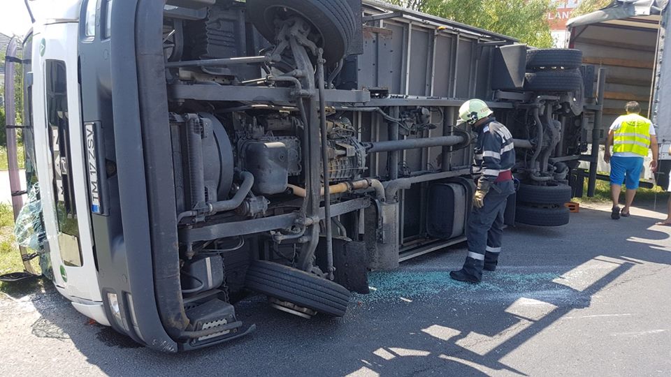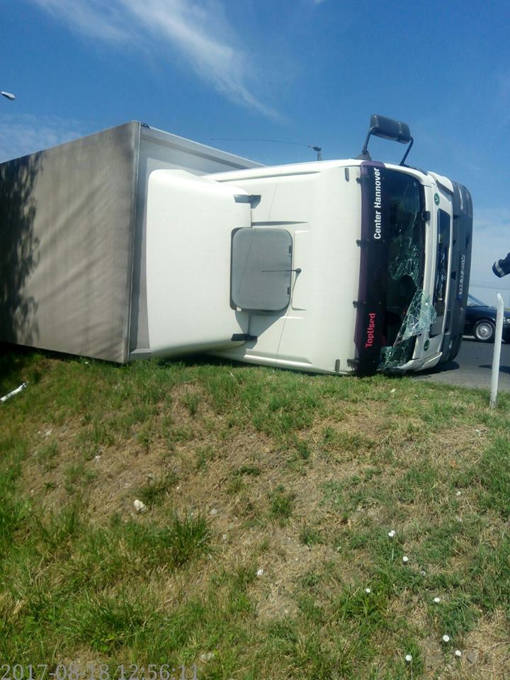 Pompierii de la Inspectoratul pentru Situaţii de Urgenţă au fost chemaţi să asigure măsurile PSI la un autotren încărcat cu paleţi şi materiale plastice, răsturnat în sensul giratoriu. Conform primelor informaţii, şoferul camionului circula pe strada Aeroportului, iar în sensul giratoriu a pierdut controlul volanului şi s-a răsturnat.