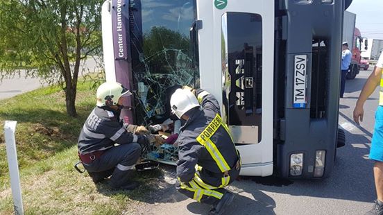 Un autotren s-a răsturnat, astăzi, în sensul giratoriul de la ieşirea din Timişoara spre Ghiroda, iar şoferul a ajuns la spital.