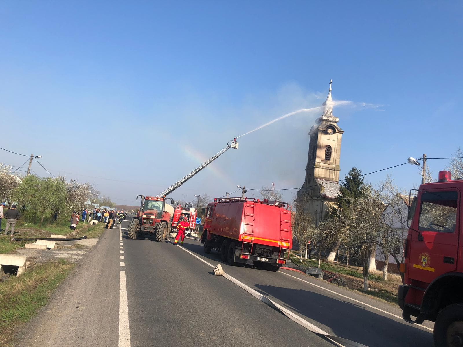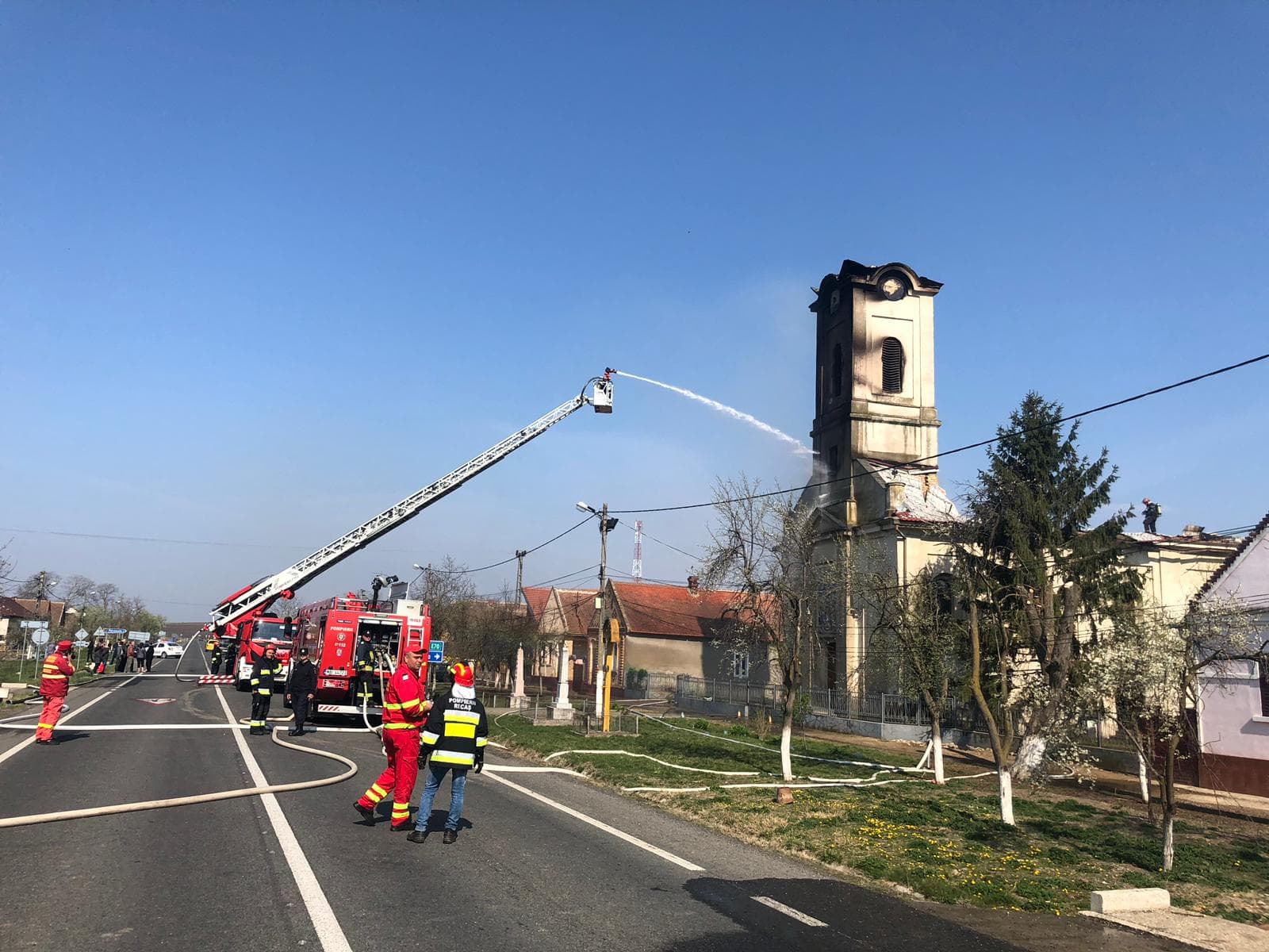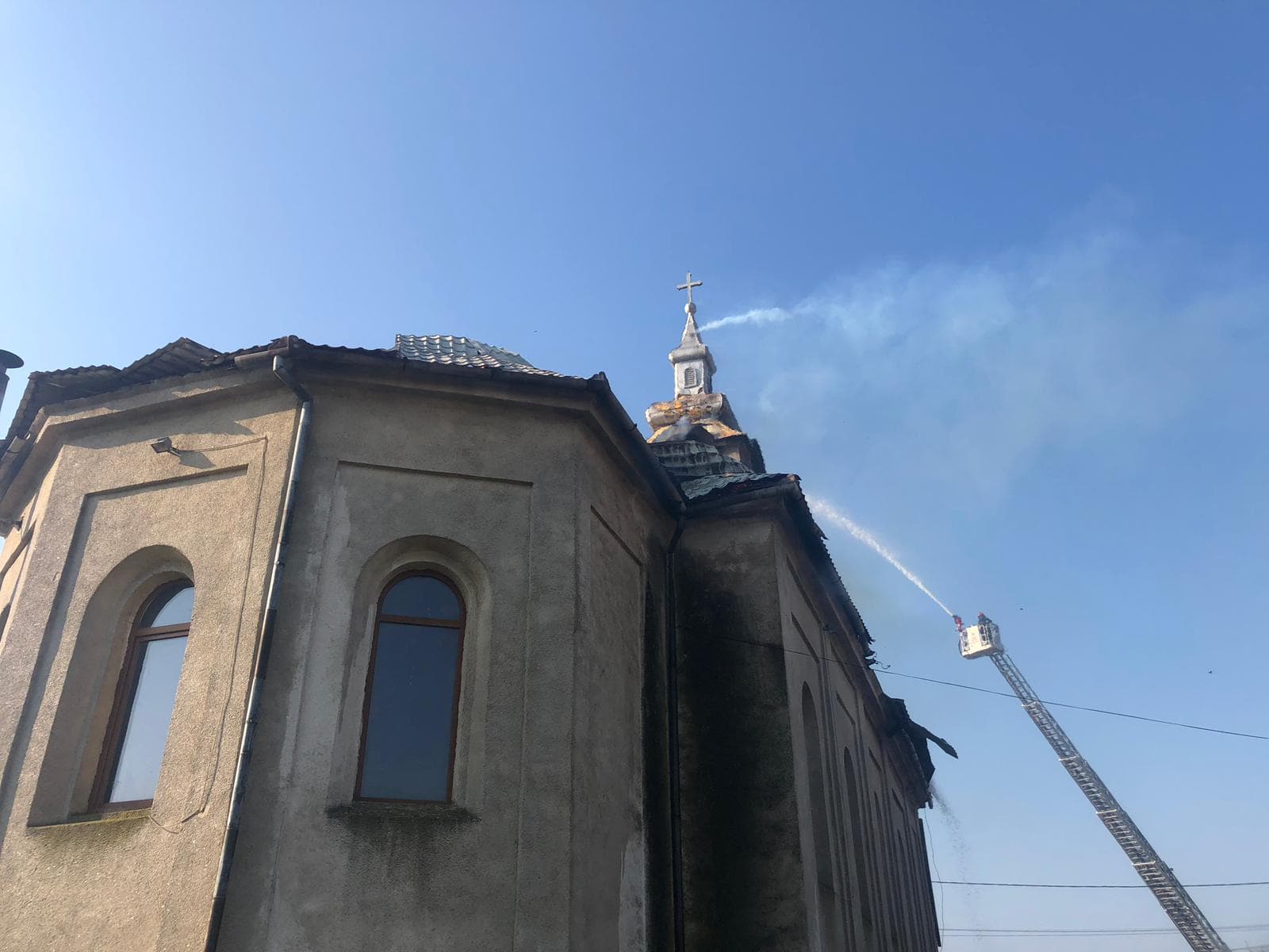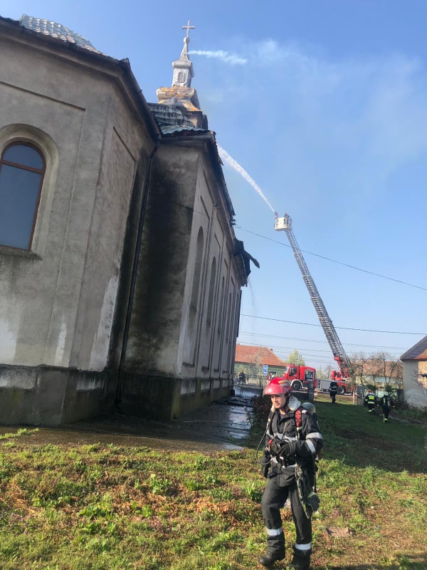 ISU Timiș intervine cu două autospeciale și o autoscară mecanică. Incendiul se manifestă cu ardere generalizată la turlă și acoperiș. Potrivit reprezentanților ISU Timiș, pompierii intervin defensive pentru că turla este construită pe structură de lemn și există pericol de prăbușire