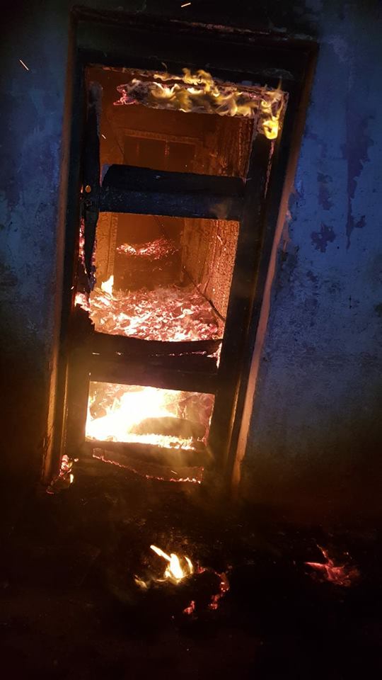 Incendiului se manifesta violent, cu flacără, pe întreaga o suprafaţă de 300 de metri pătraţi. Tavanele construite din lemn şi materialele depozitate în clădire au facilitat extinderea rapidă a incendiului şi exista şi riscul propagării la câteva anexe apropiate.